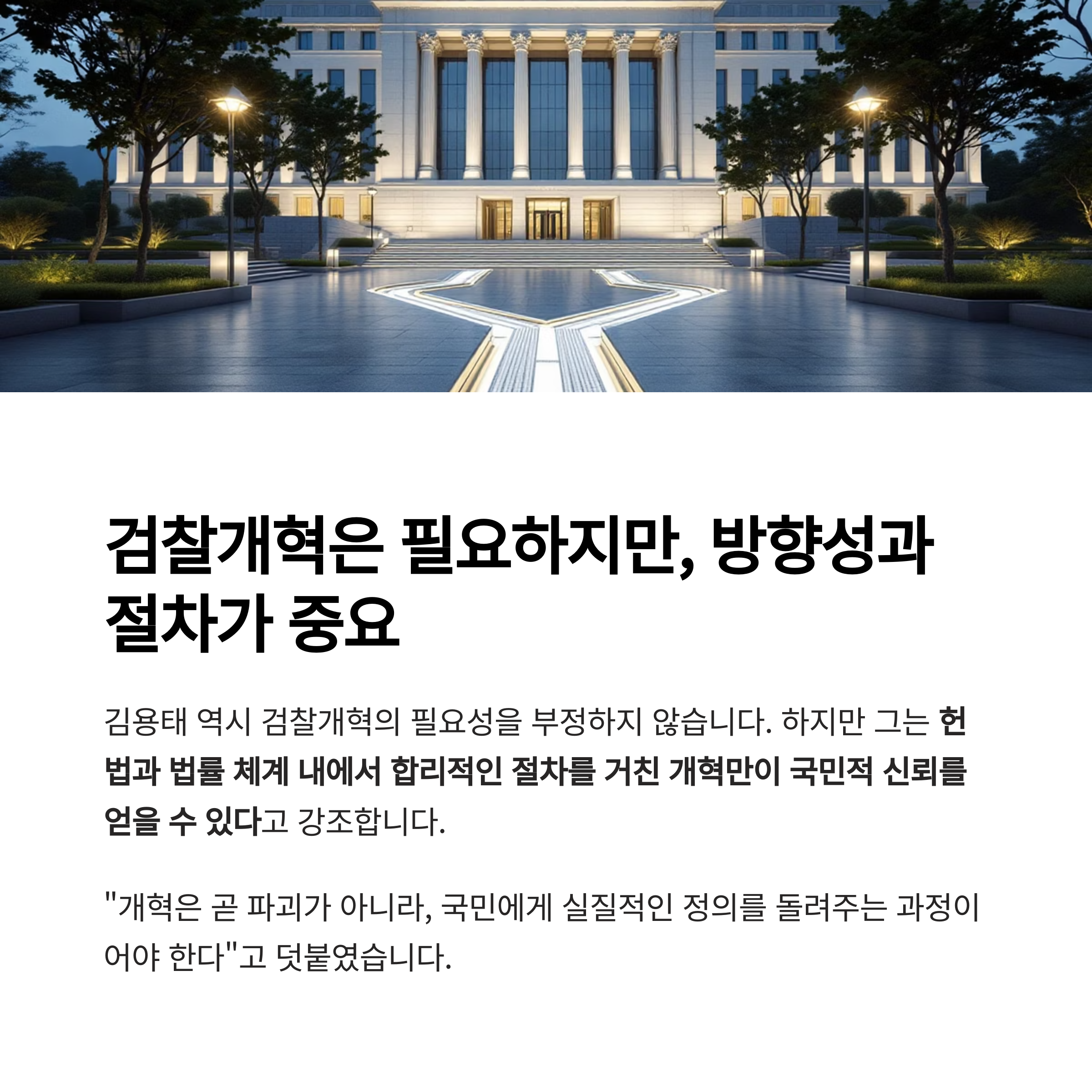 하지만 그는 헌법과 법률 체계 내에서 합리적인 절차를 거친 개혁만이 국민적 신뢰를 얻을 수 있다고 강조합니다.
