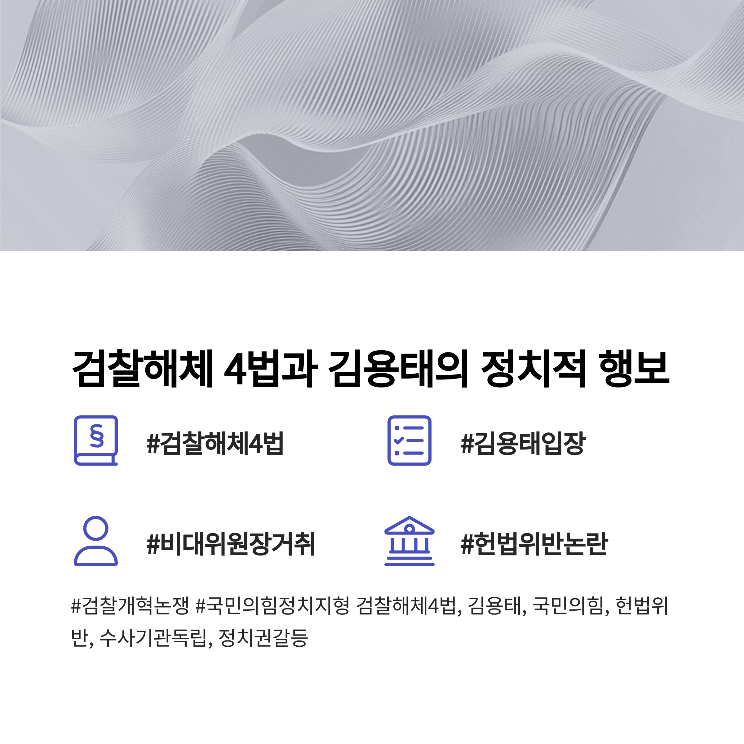 김용태 국민의힘 비상대책위원은 더불어민주당이 발의한 ‘검찰해체 4법’에 대해 위헌적이고 위험한 시도라고 강력히 반대하고 있습니다.