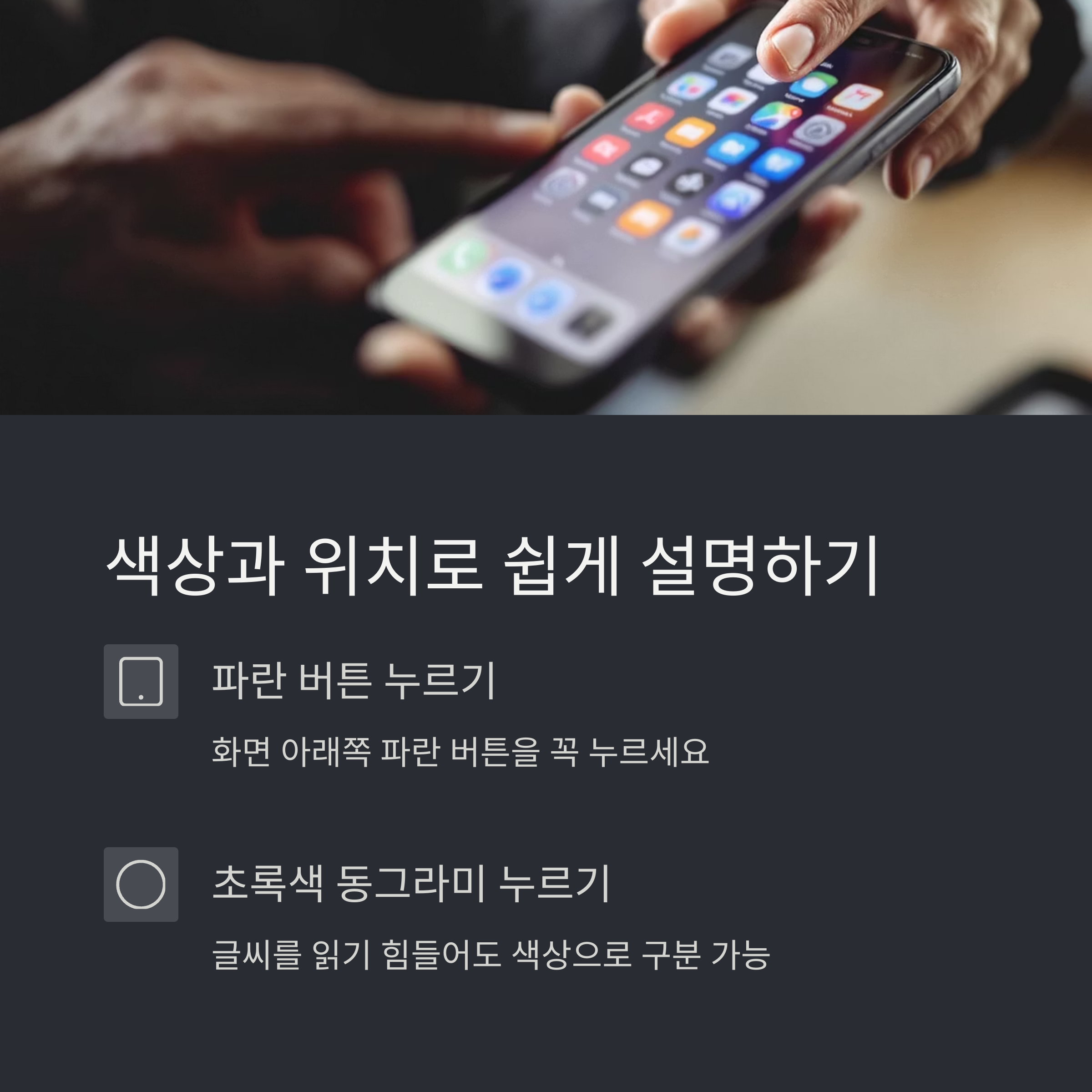 "화면 아래쪽 파란 버튼을 꼭 누르세요"처럼 색상이나 위치 기준으로 설명되어 있어