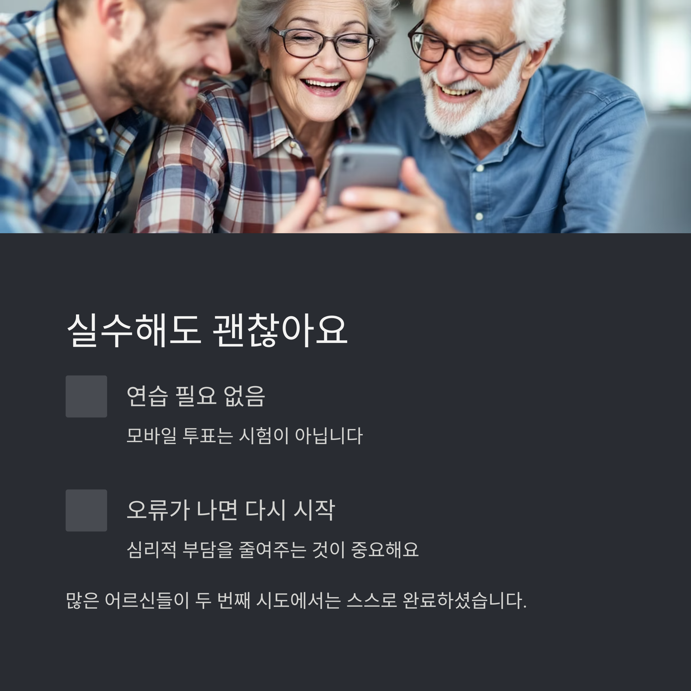 실제로 많은 어르신들이 두 번째 시도에서는 스스로 완료하셨습니다.