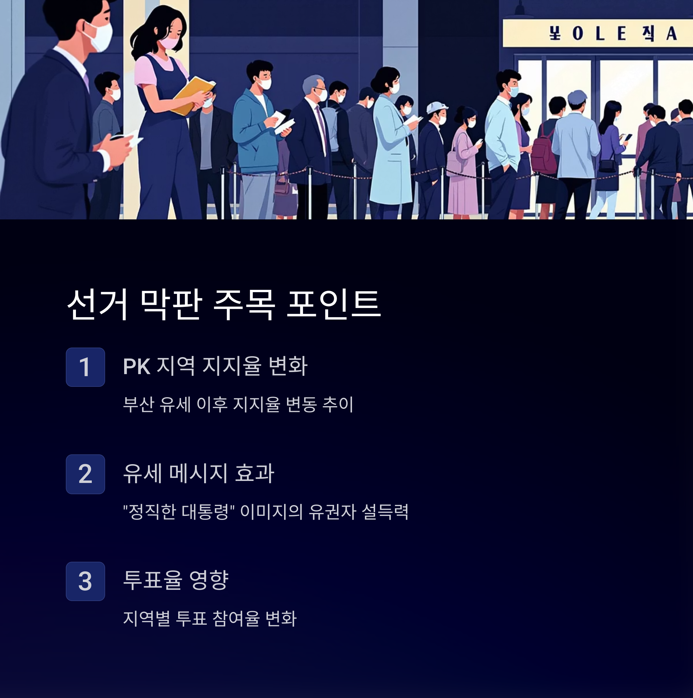 대선 이틀 전, 이재명 후보가 부산 유세를 통해 지지율 반등을 노리고 있습니다. 부산·울산·경남(PK) 지역에서의 지지율 격차를 줄이기 위한 전략적 행보로 분석됩니다.(YTN, 연합뉴스)
