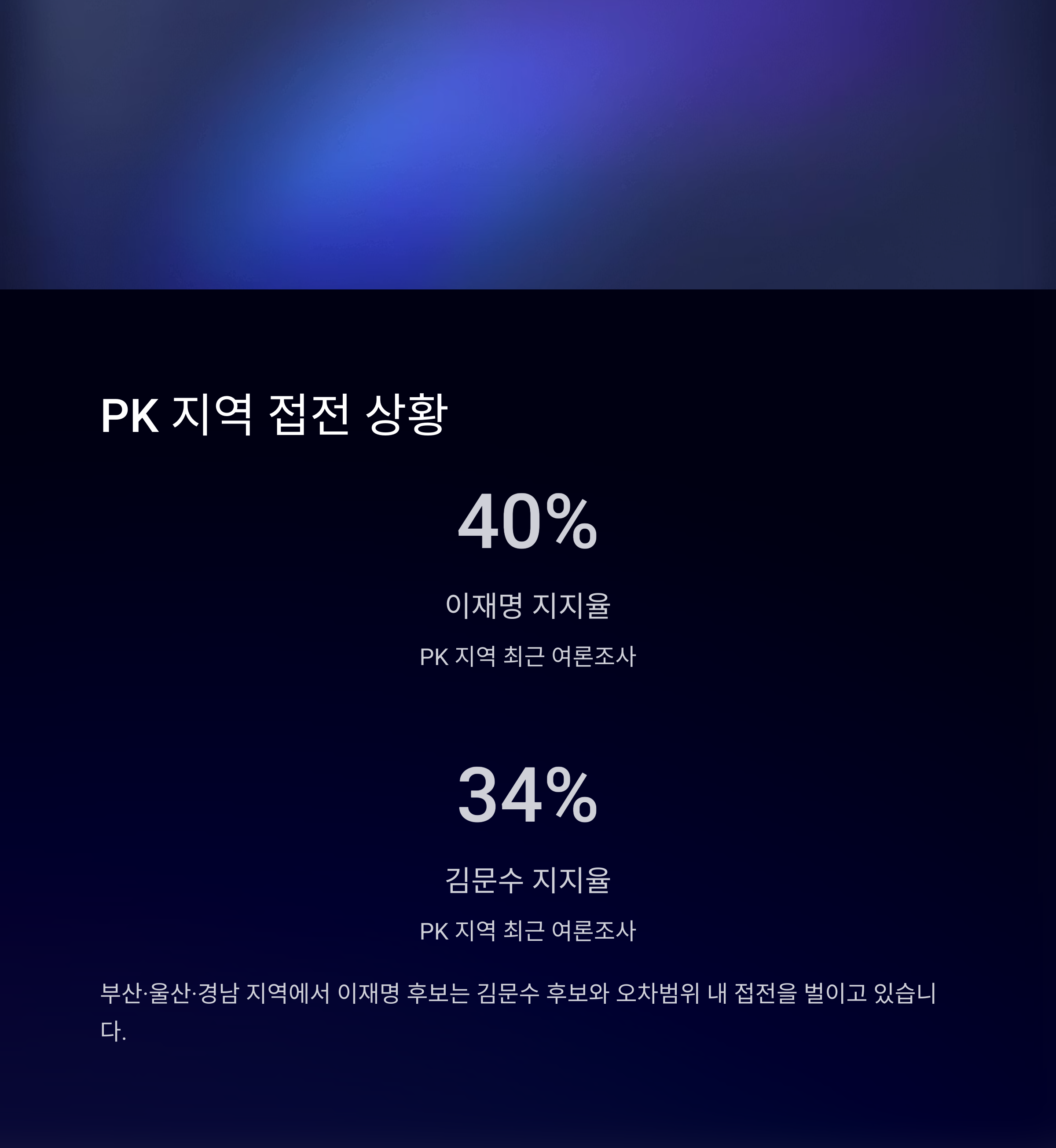 최근 여론조사에 따르면, 부산·울산·경남(PK) 지역에서 이재명 후보는 40%의 지지율을 기록하며 김문수 후보(34%)와 오차범위 내 접전을 벌이고 있습니다. 이는 지난 대선에 비해 이재명 후보의 지지율이 상승한 것으로 나타났습니다 .(연합뉴스)