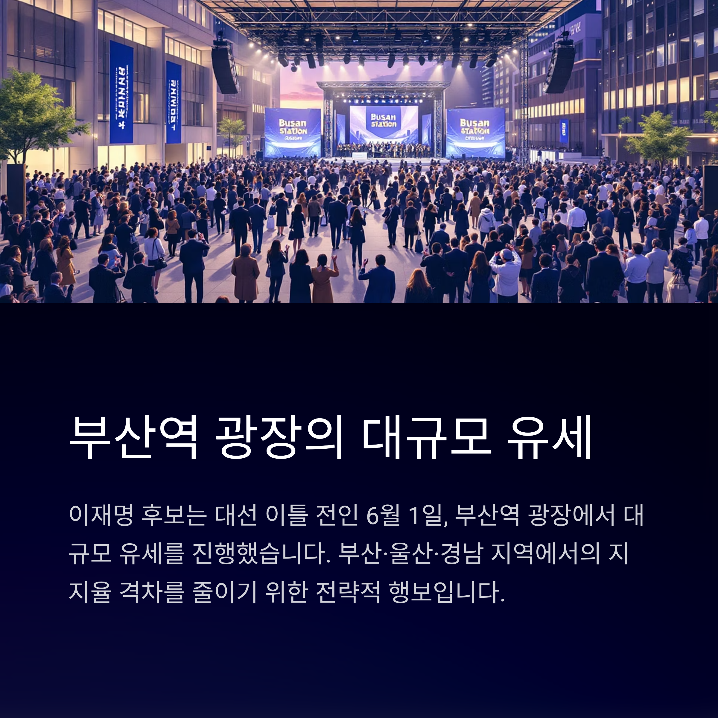 이재명 후보는 대선 이틀 전인 6월 1일, 부산역 광장에서 대규모 유세를 진행했습니다. 이날 유세는 부산·울산·경남 지역에서의 지지율 격차를 줄이기 위한 전략적 행보로 분석됩니다.(YTN, 연합뉴스)