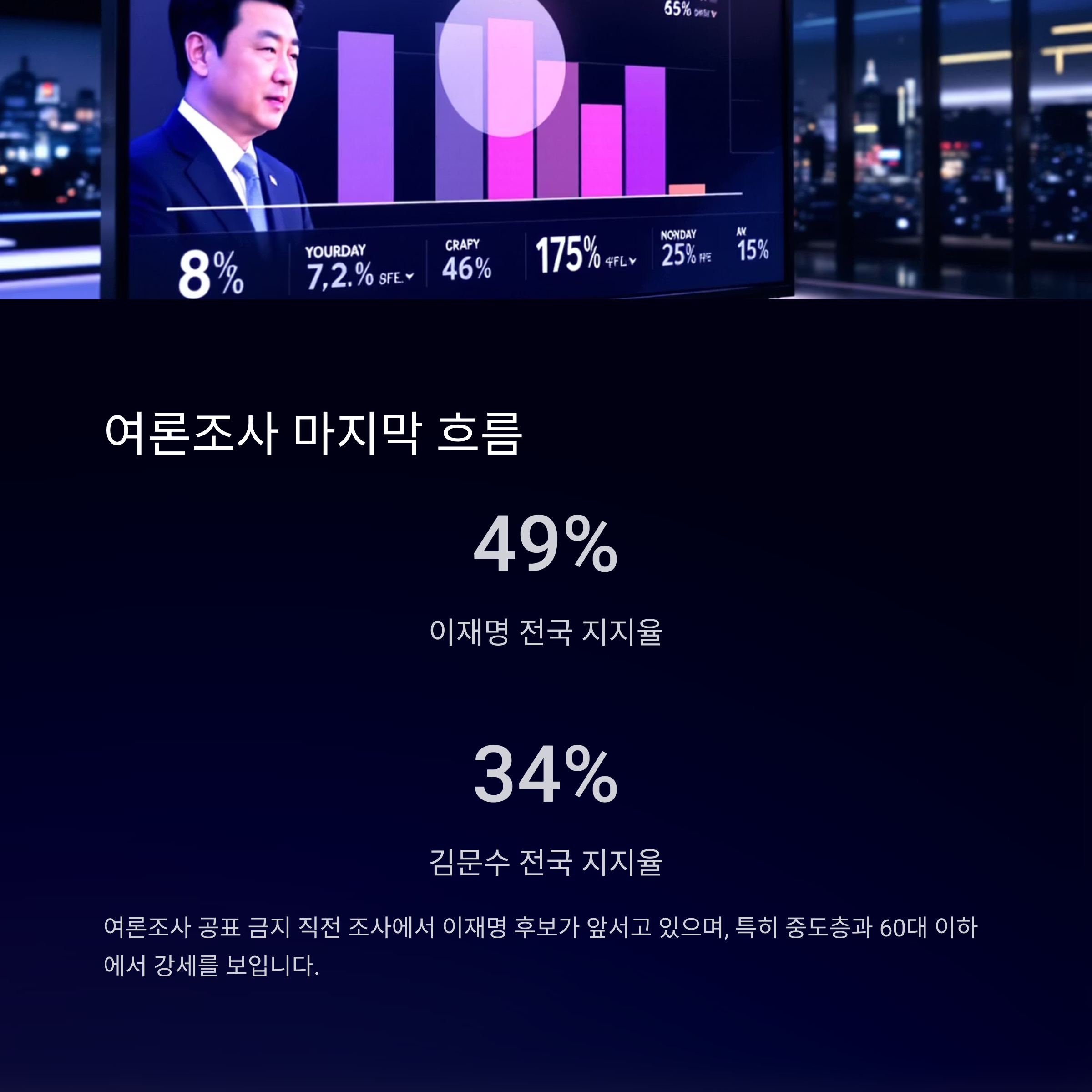 여론조사 공표 금지 직전에 실시된 조사에서는 이재명 후보가 전국 지지율 49%를 기록하며 김문수 후보(34%)를 앞서고 있습니다. 특히, 중도층과 60대 이하 연령층에서 이재명 후보의 지지율이 높게 나타났습니다 .(연합뉴스)