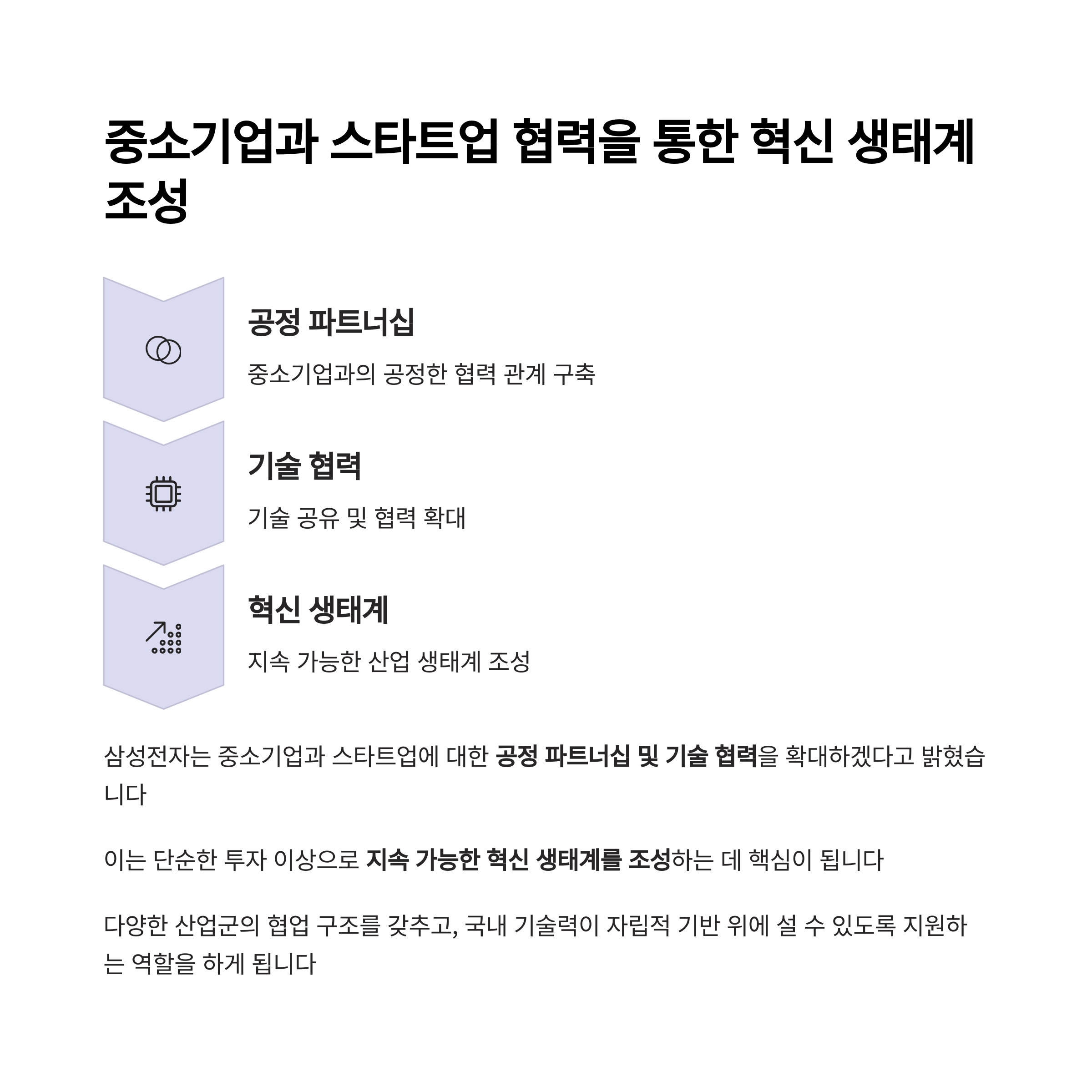 삼성전자는 중소기업과 스타트업에 대한 공정 파트너십 및 기술 협력을 확대하겠다고 밝혔습니다