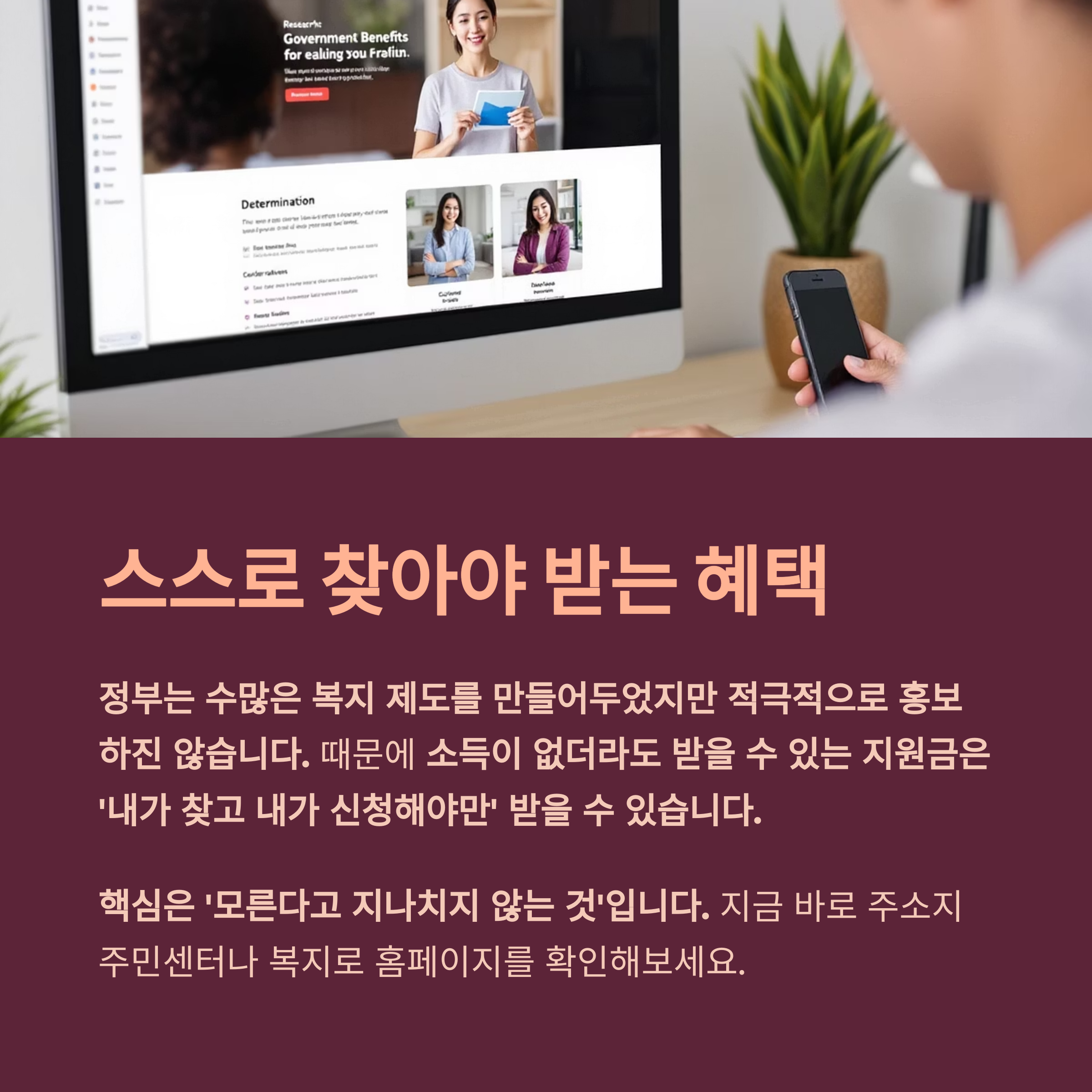 핵심은 ‘모른다고 지나치지 않는 것’입니다. 지금 바로 주소지 주민센터나 복지로 홈페이지를 확인해보세요.