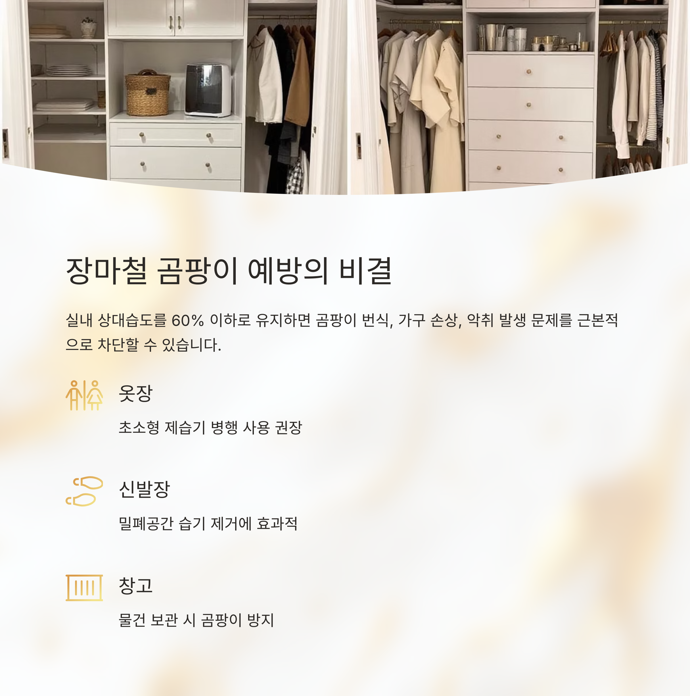 특히 옷장, 신발장, 창고 등 밀폐 공간에서는 초소형 제습기를 병행 사용하는 것이 효과적입니다.