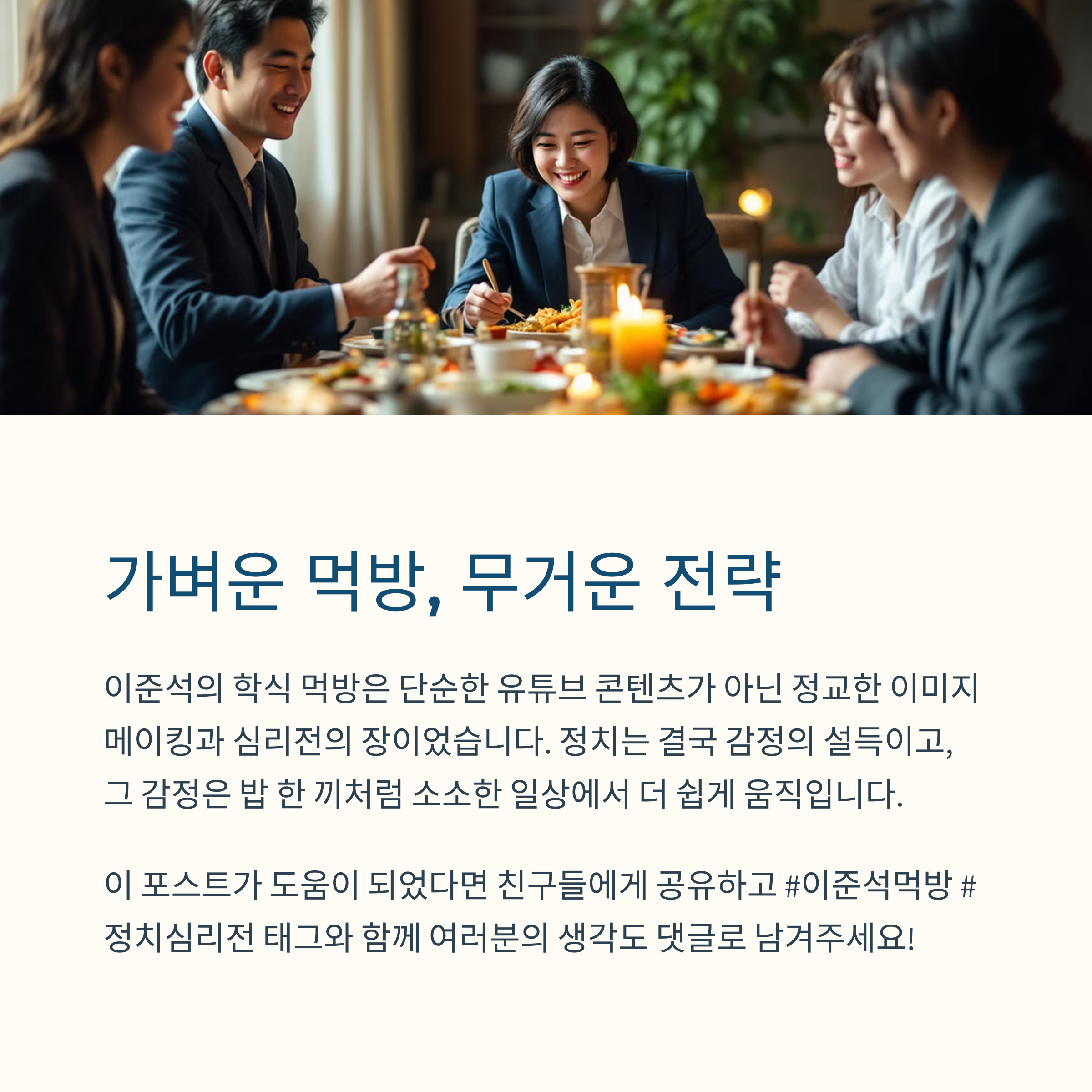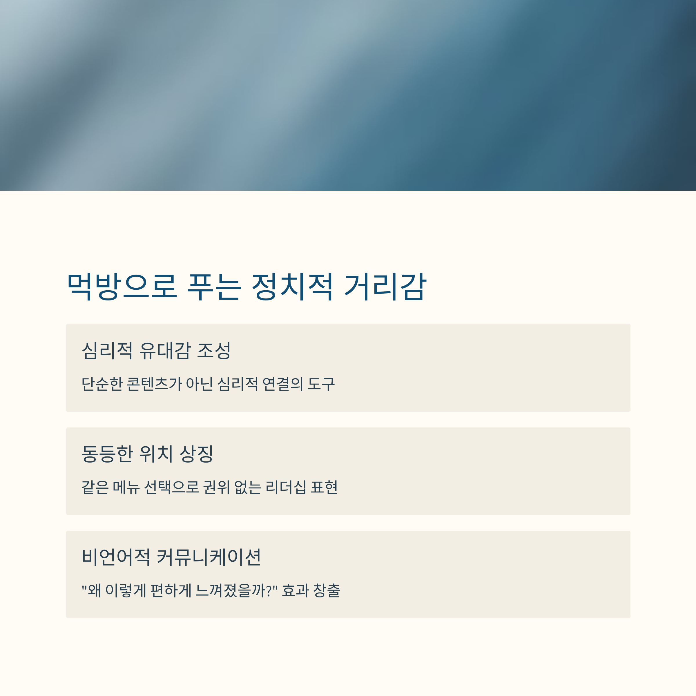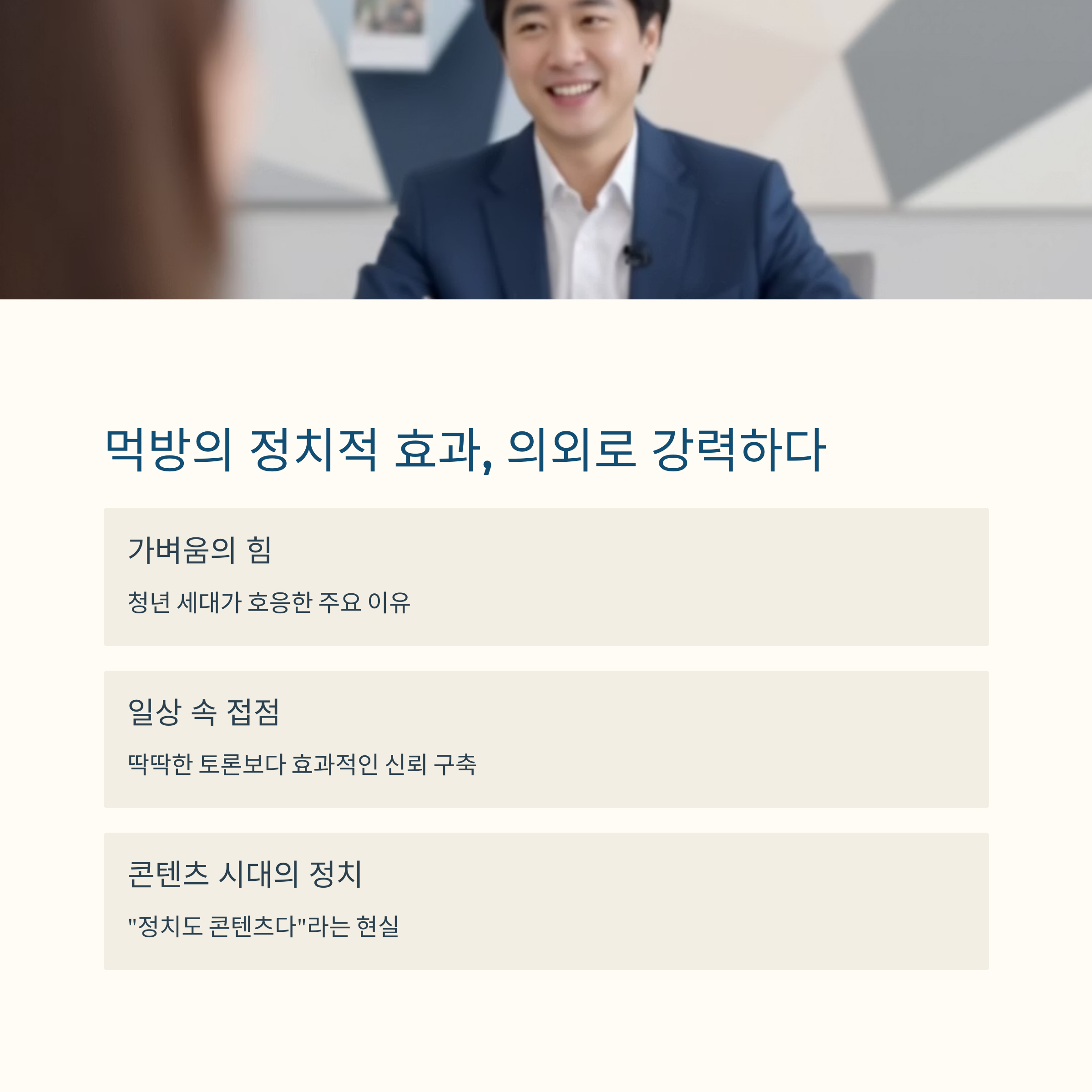 정치 마케팅 관점에서 보면, 먹방은 ‘관찰 가능한 진정성’의 테스트 장면입니다.