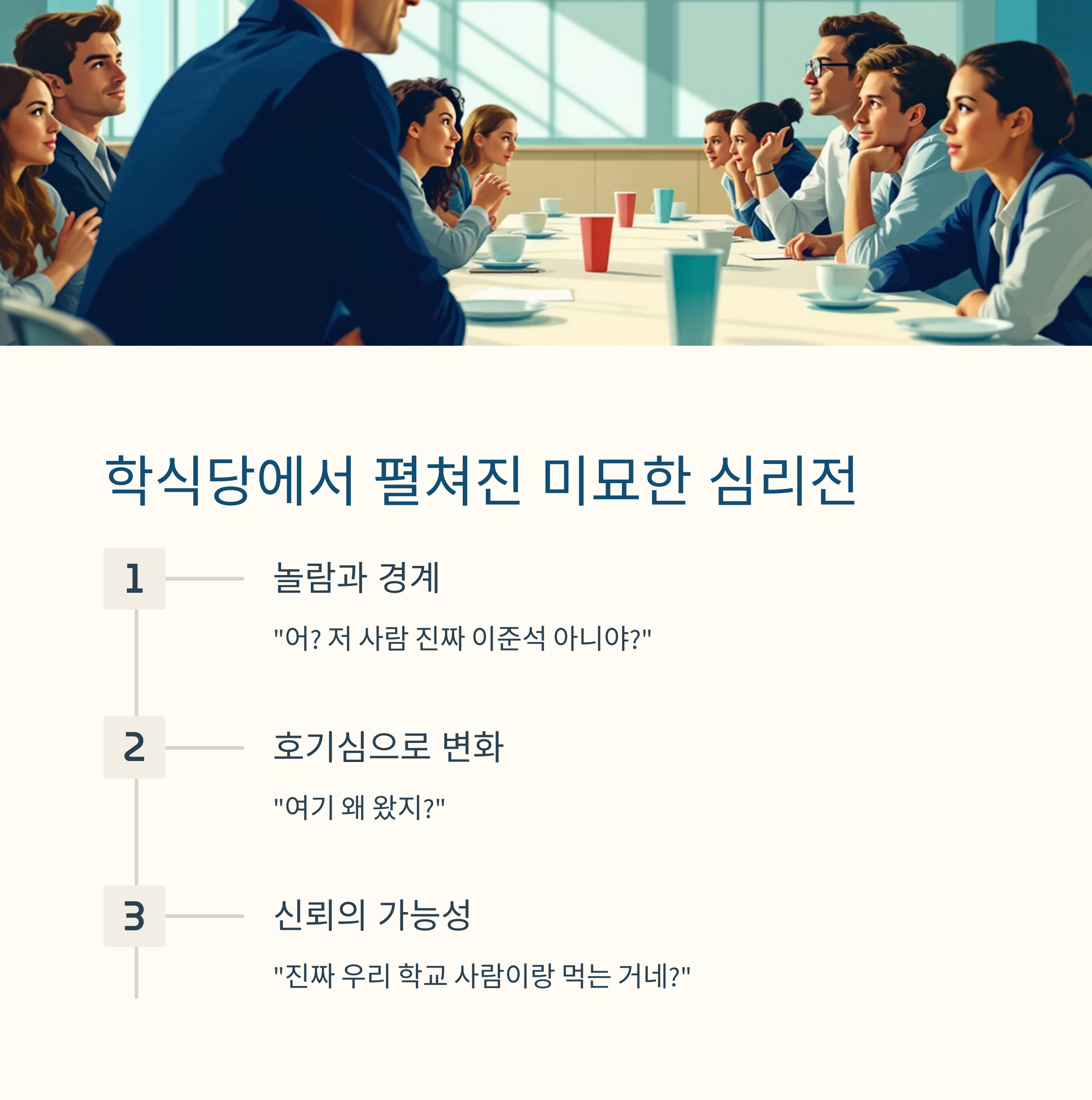 학식당 구석 테이블에서 속삭이던 학생들은 처음엔 놀람과 경계를 보였지만,