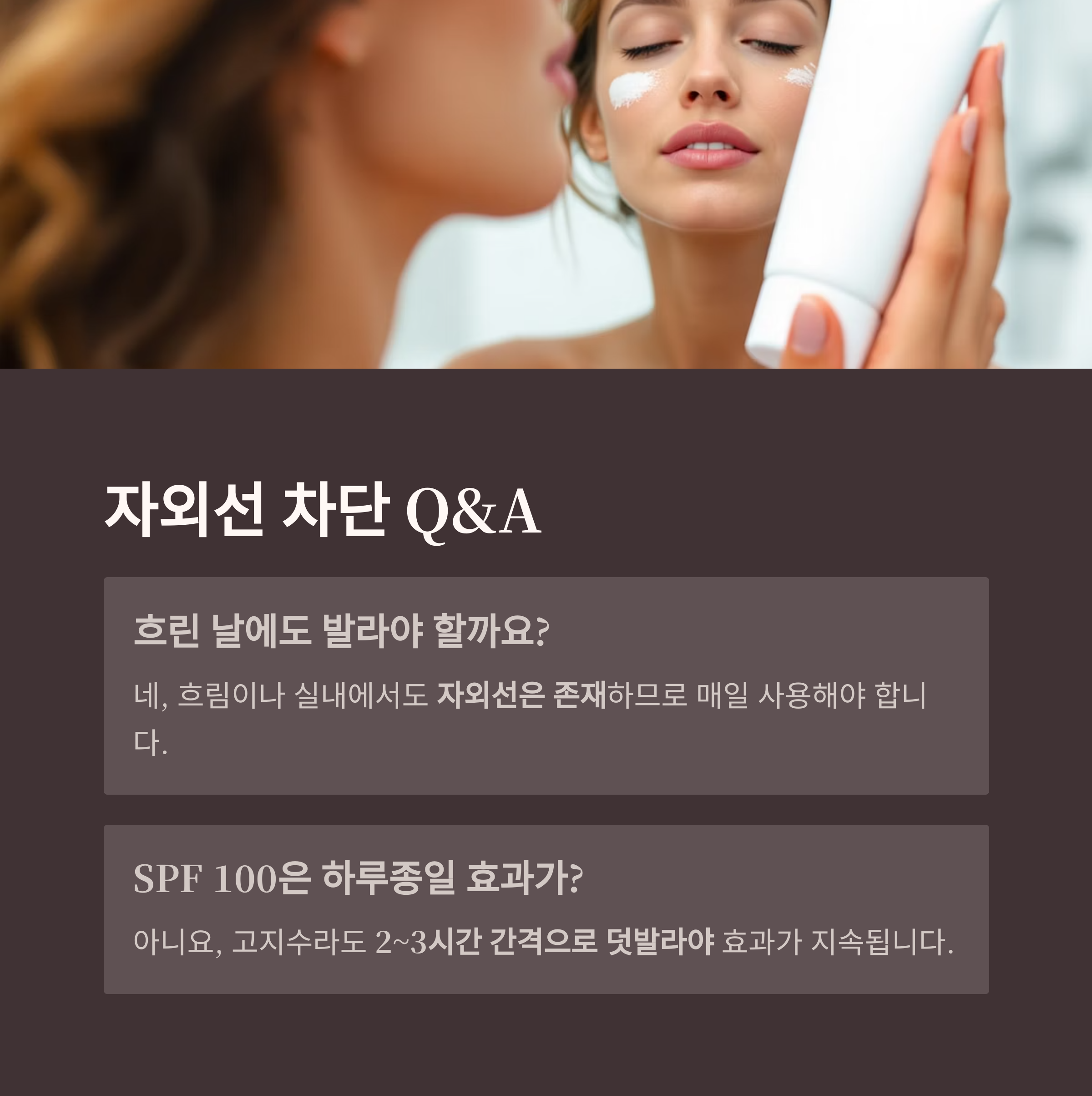 A: 흐림이나 실내에서도 자외선은 존재하므로 매일 사용해야 합니다.