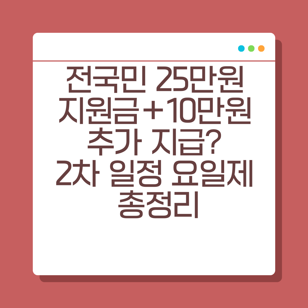 정부가 추진 중인 전국민 대상 25만원 지원금 지급이 다시금 현실화되며, 추가 10만원까지 지급된다는 이야기가 퍼지고 있습니다. 정확한 2차 지급 일정과 요일제 방식, 신청 요령을 한눈에 정리해드립니다. 요일제 적용 기준과 대상별 신청 링크, 클릭 유도를 위한 알맞은 접속 버튼도 포함되어 있으니 끝까지 확인하시기 바랍니다.