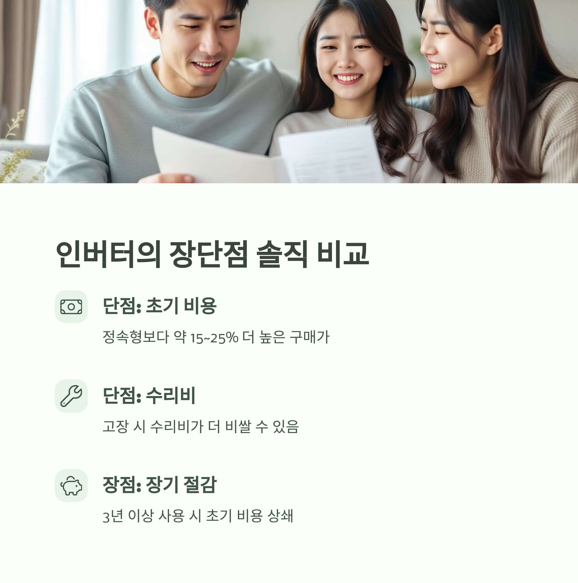 고장 시 수리비가 비쌀 수 있고, 초기 구매가는 정속형보다 약 15~25% 더 높습니다.