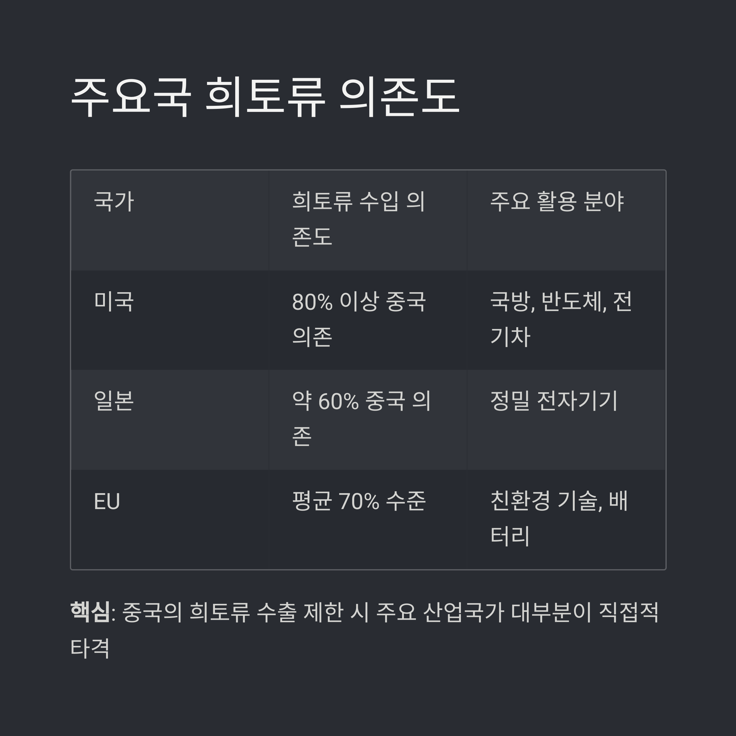 | 미국 | 80% 이상 중국 의존 | 국방, 반도체, 전기차 |