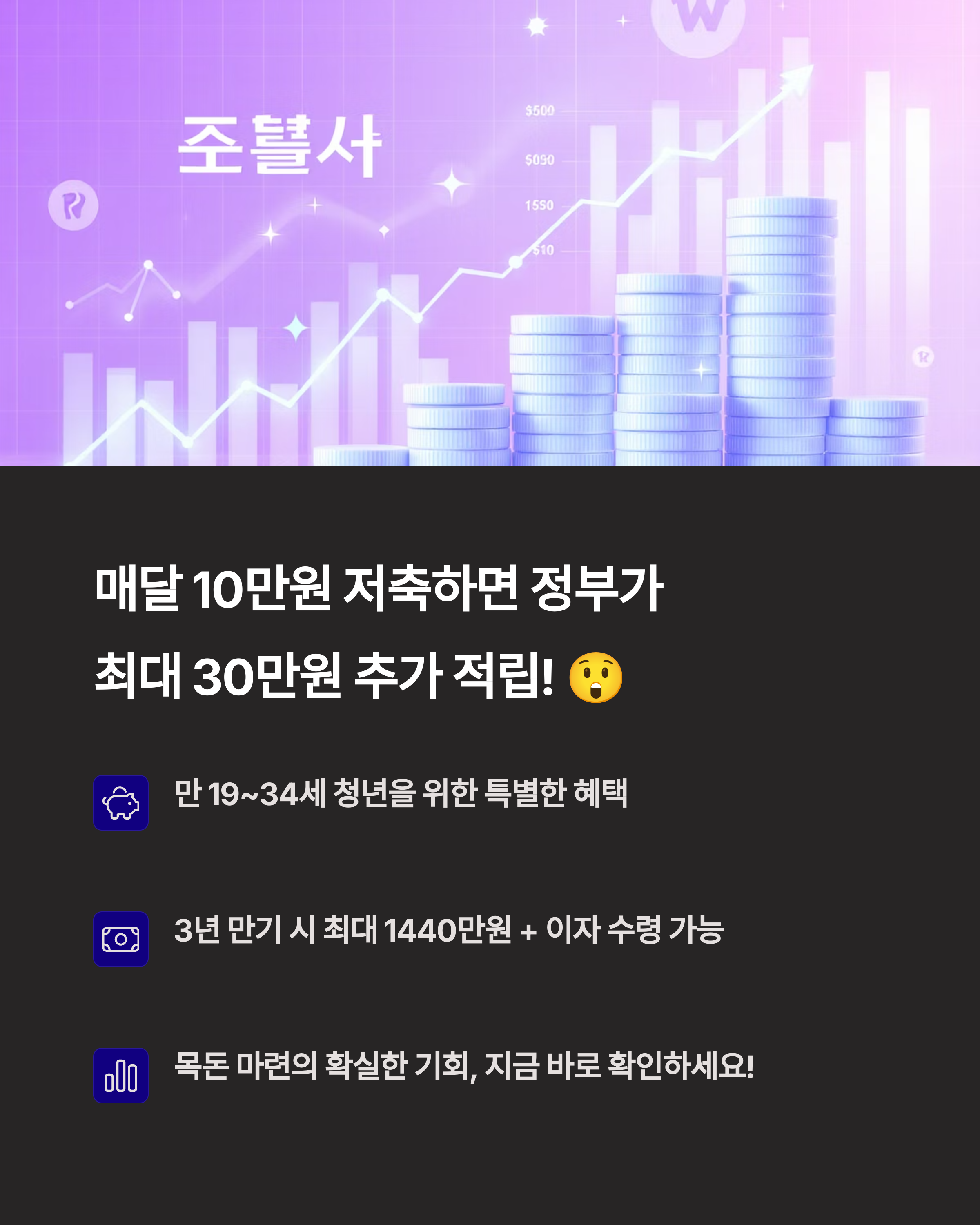 | 만 19~34세, 중위소득 100% 이하, 근로자 | 복지로 사이트 또는 행정복지센터 방문 접수 | 월 최대 30만 원, 3년간 총 1,440만 원 적립 가능 |