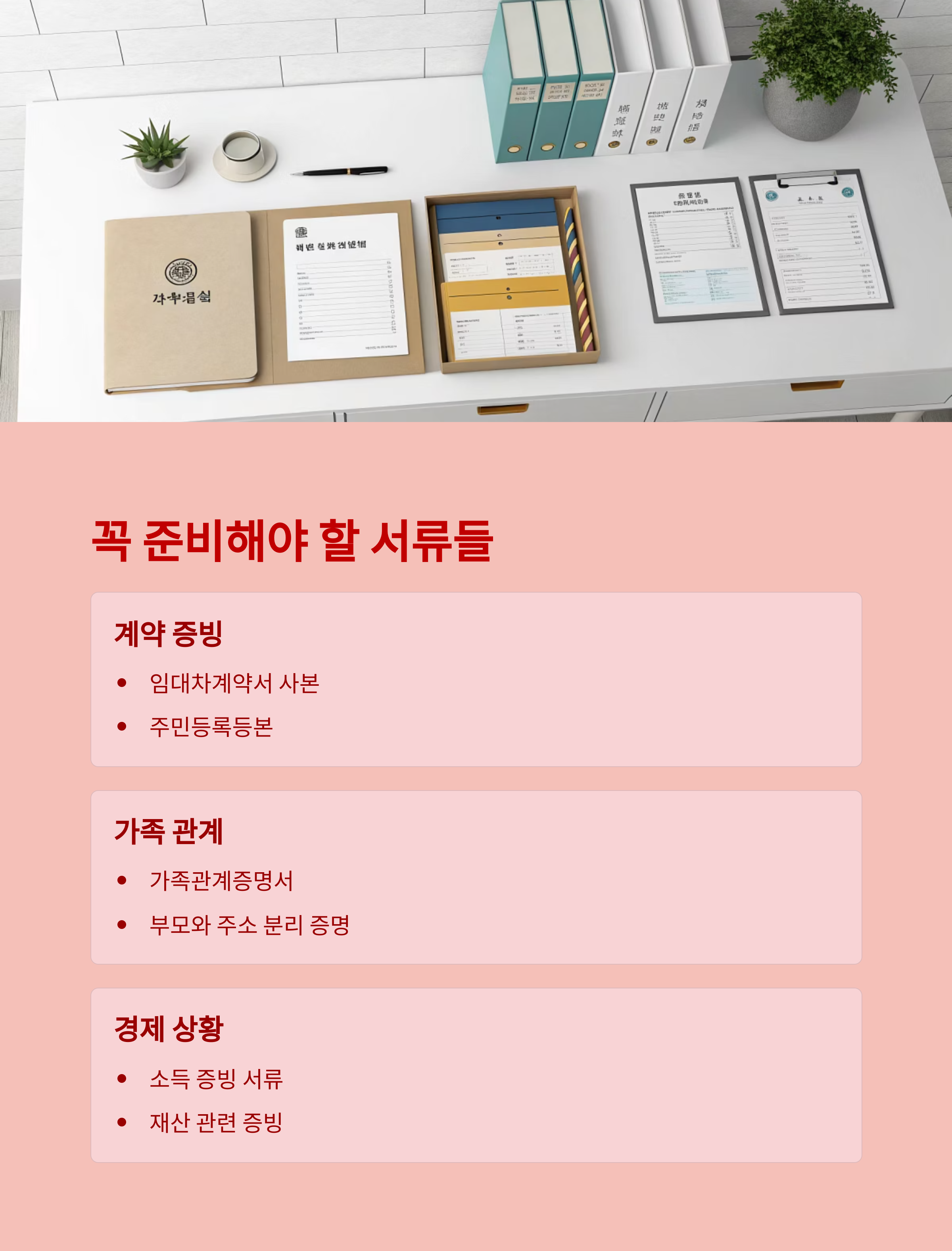 신청은 복지로 누리집에서 온라인으로 진행 가능하며, 최근에는 정부24에서도 간편하게 신청할 수 있도록 시스템이 개선되었습니다. 신청자는 임대차계약서, 가족관계증명서, 재산 및 소득 증빙 등의 서류를 준비해야 하며, 제출 후 평균 1~2개월 안에 지원 여부가 통보됩니다. 신청 시 주소가 실제 거주지와 일치해야 하며 부모와 주민등록상 분리되어 있어야 한다는 점도 중요한 요건입니다.