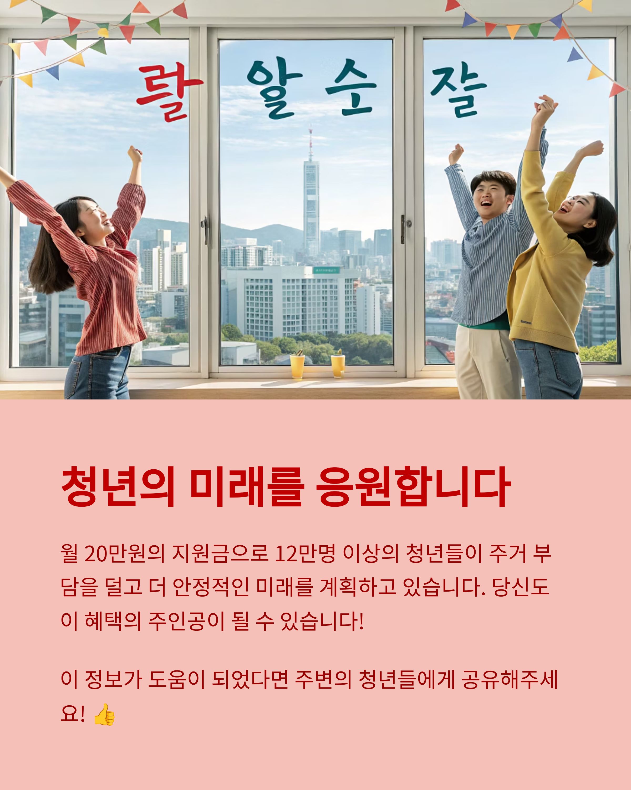 청년들의 주거 안정은 곧 사회 전체의 안정성과 연결됩니다. 청년월세 지원 제도는 단기적 혜택을 넘어서 청년층의 독립을 돕고 생활 기반을 안정화하는 사회적 안전망의 일환입니다. 신청 조건이 까다롭다고 느껴질 수 있지만, 정확한 정보와 준비만 있다면 누구나 도전해볼 수 있습니다. 월세 부담을 덜고 보다 자유롭고 안정적인 삶을 꿈꾸는 청년들에게 이 제도가 든든한 디딤돌이 되길 바랍니다.