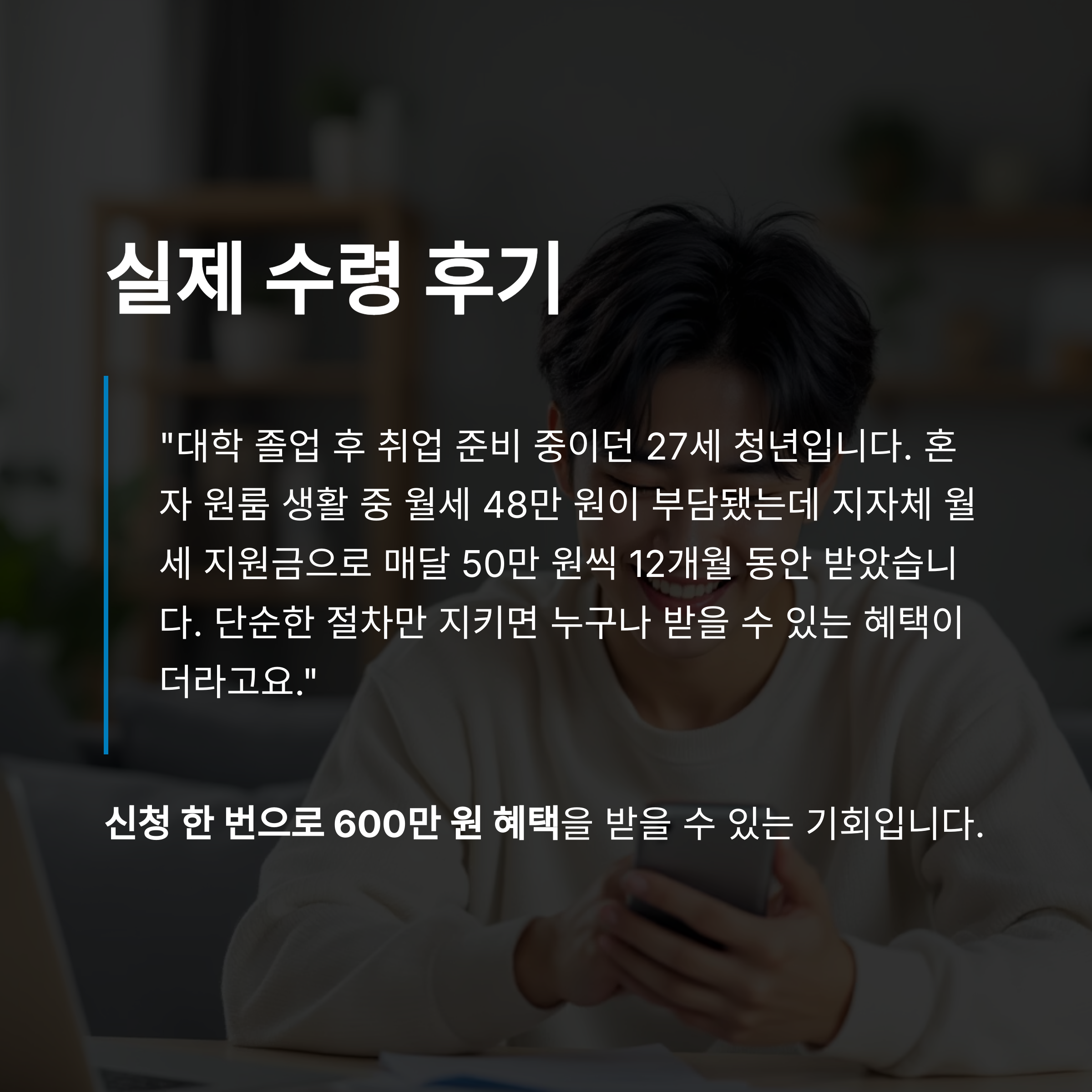 지자체 월세 지원금으로 매달 50만 원씩 12개월 동안 받았습니다.