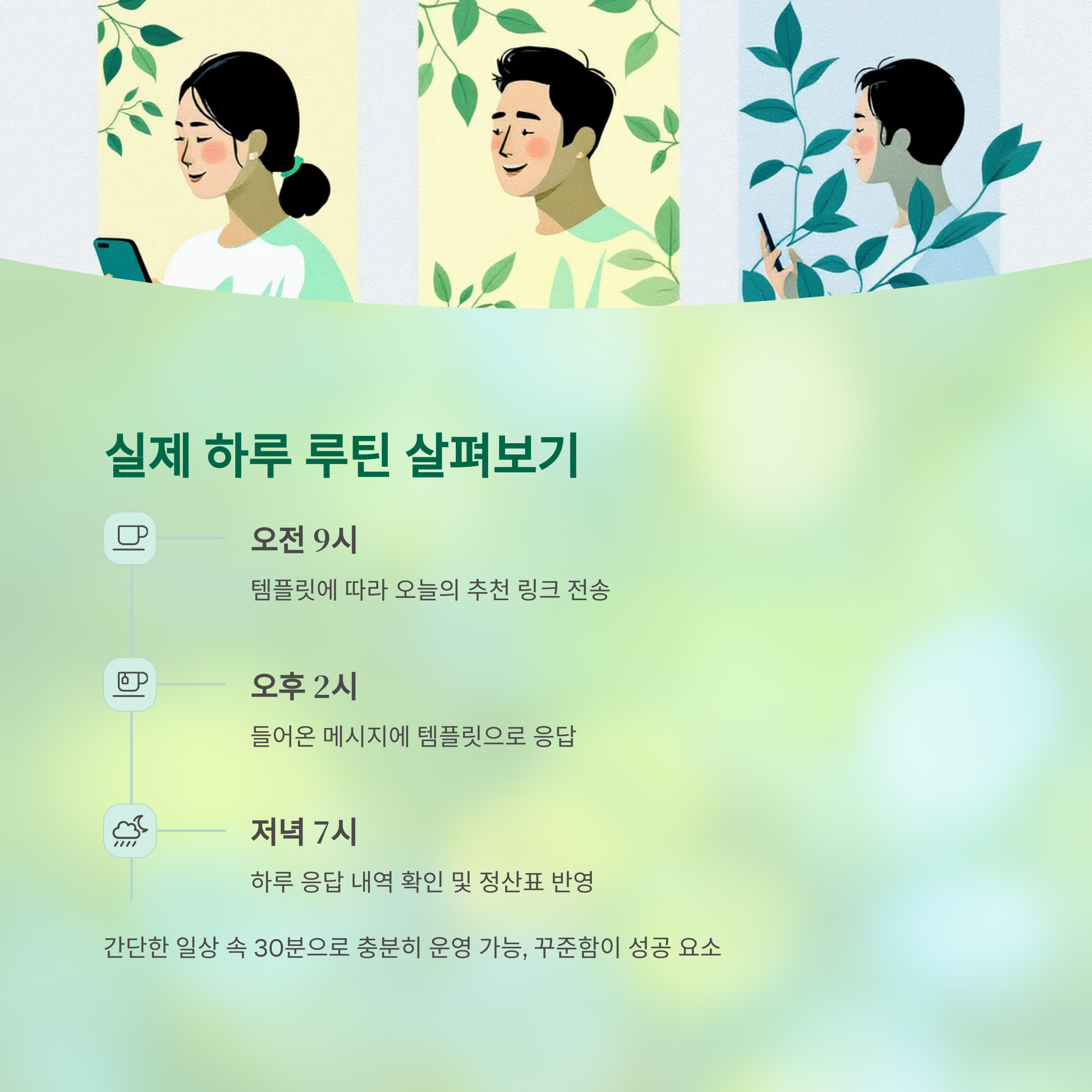 "오전 9시, 템플릿에 따라 오늘의 추천 링크를 전송합니다.