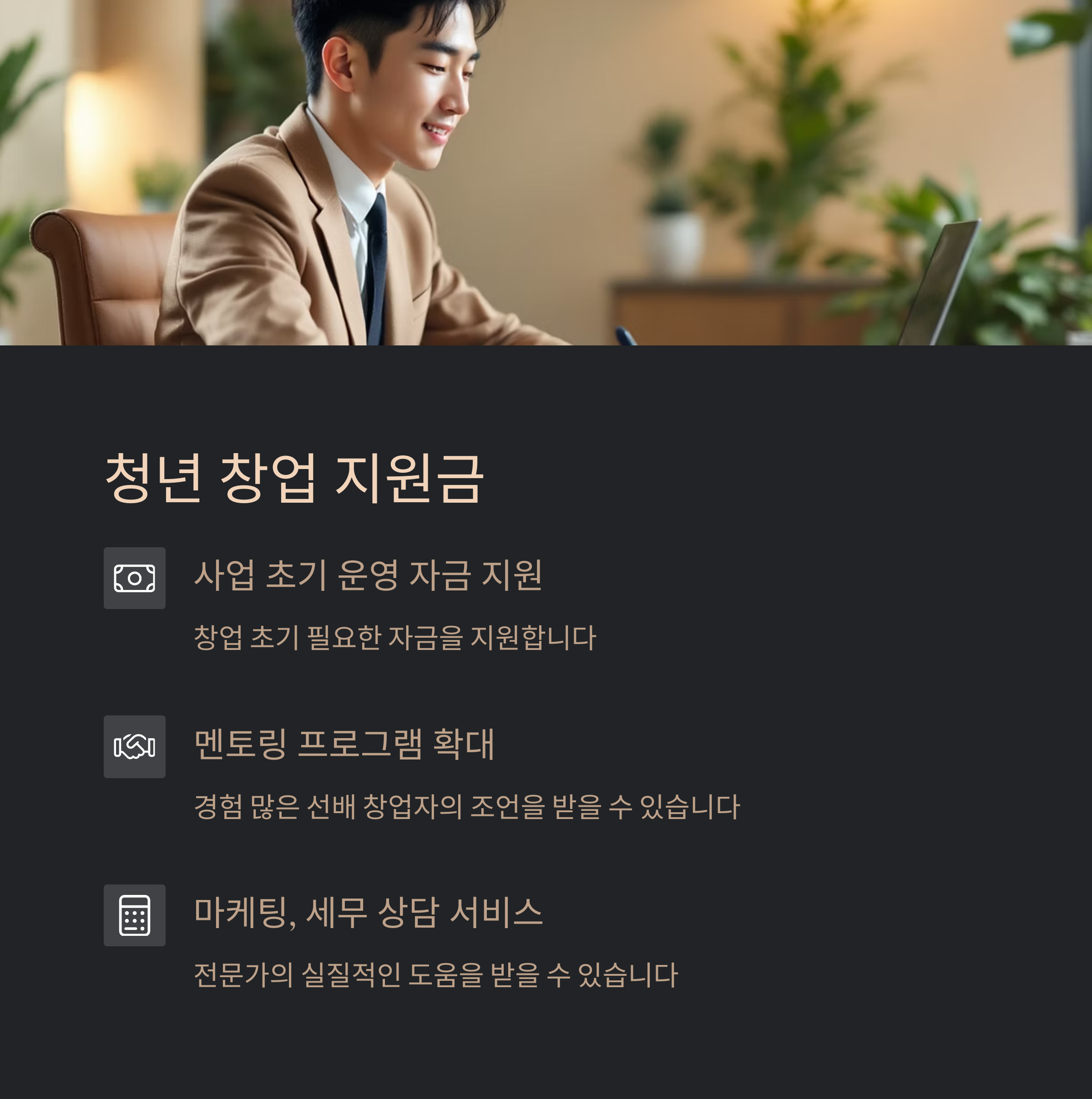 청년 창업자는 사업 초기 운영 자금뿐 아니라 마케팅, 세무 상담 서비스도 제공받을 수 있습니다.