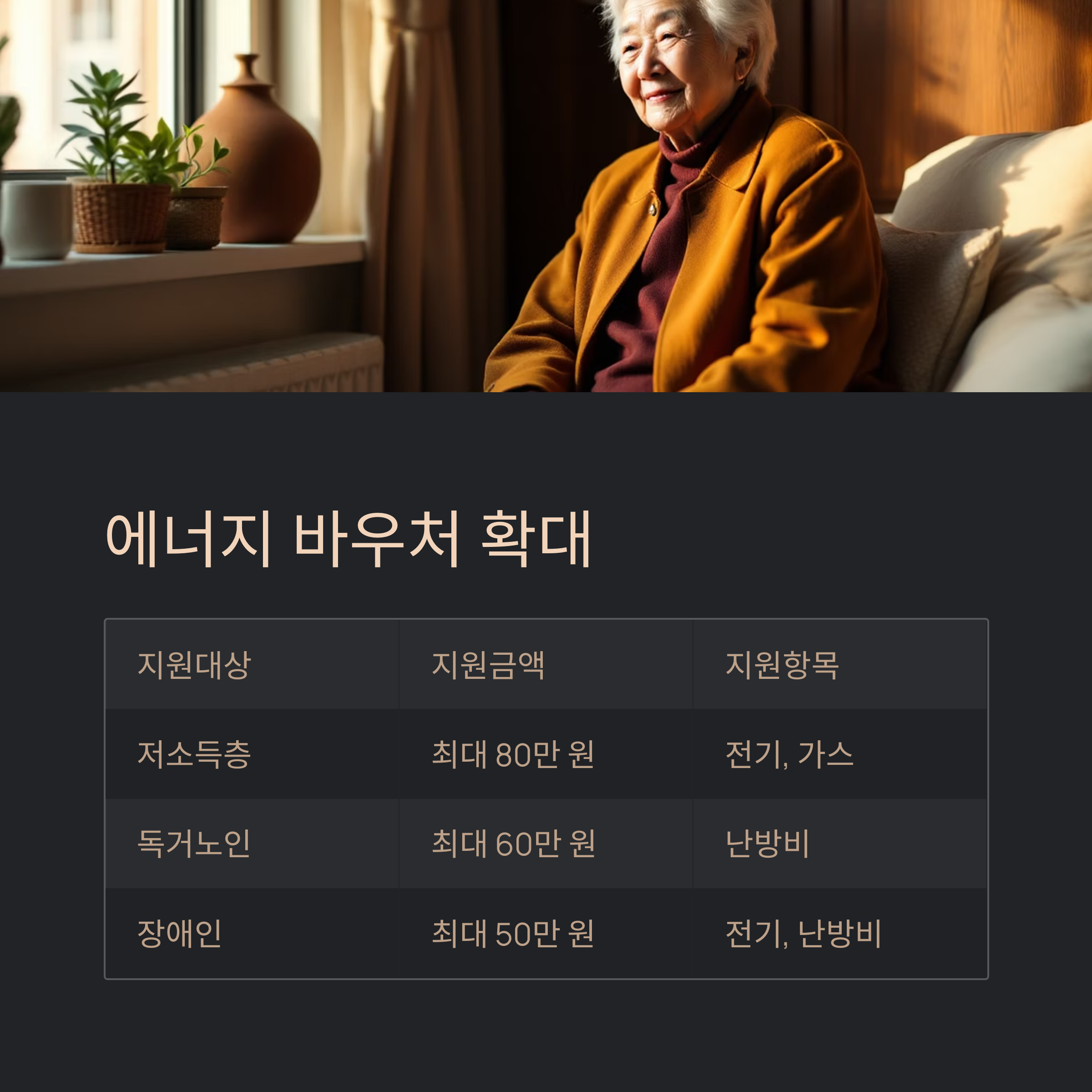 기존 에너지 바우처가 확대되어 저소득층, 독거노인, 장애인 가정이 추가로 혜택을 받을 수 있게 되었습니다.