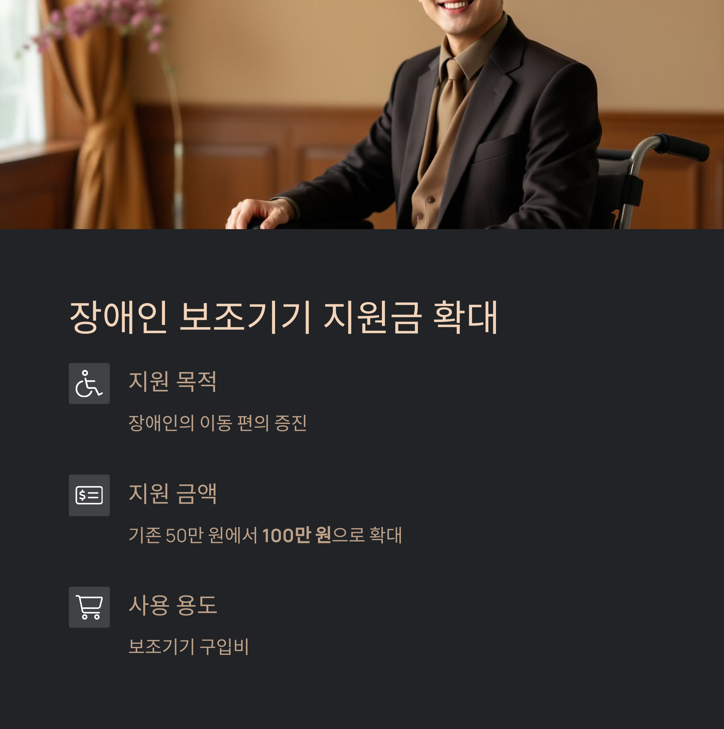 장애인의 이동 편의 증진을 위해 보조기기 구입비 지원금이 확대되었습니다.