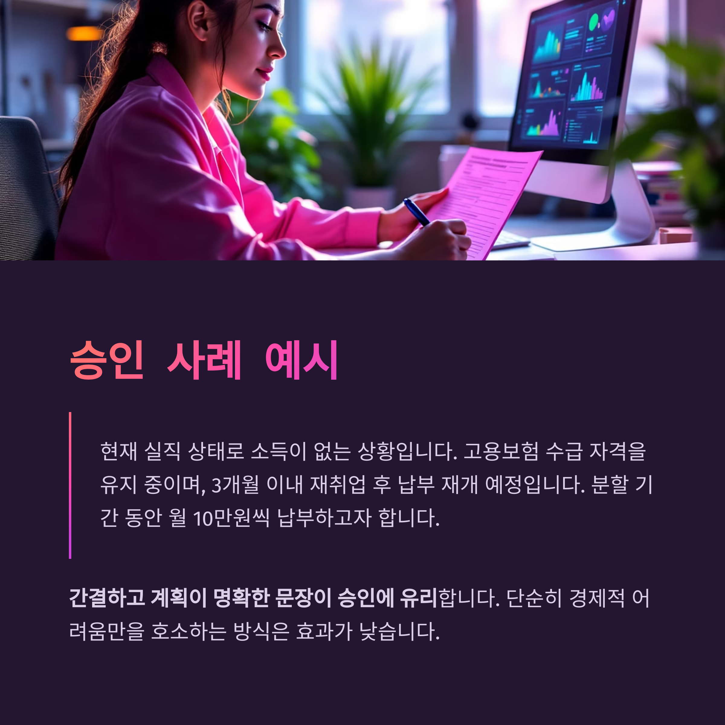셋째, 신청서 작성 시 "향후 납부 계획"을 구체적으로 적는 것이 중요합니다.