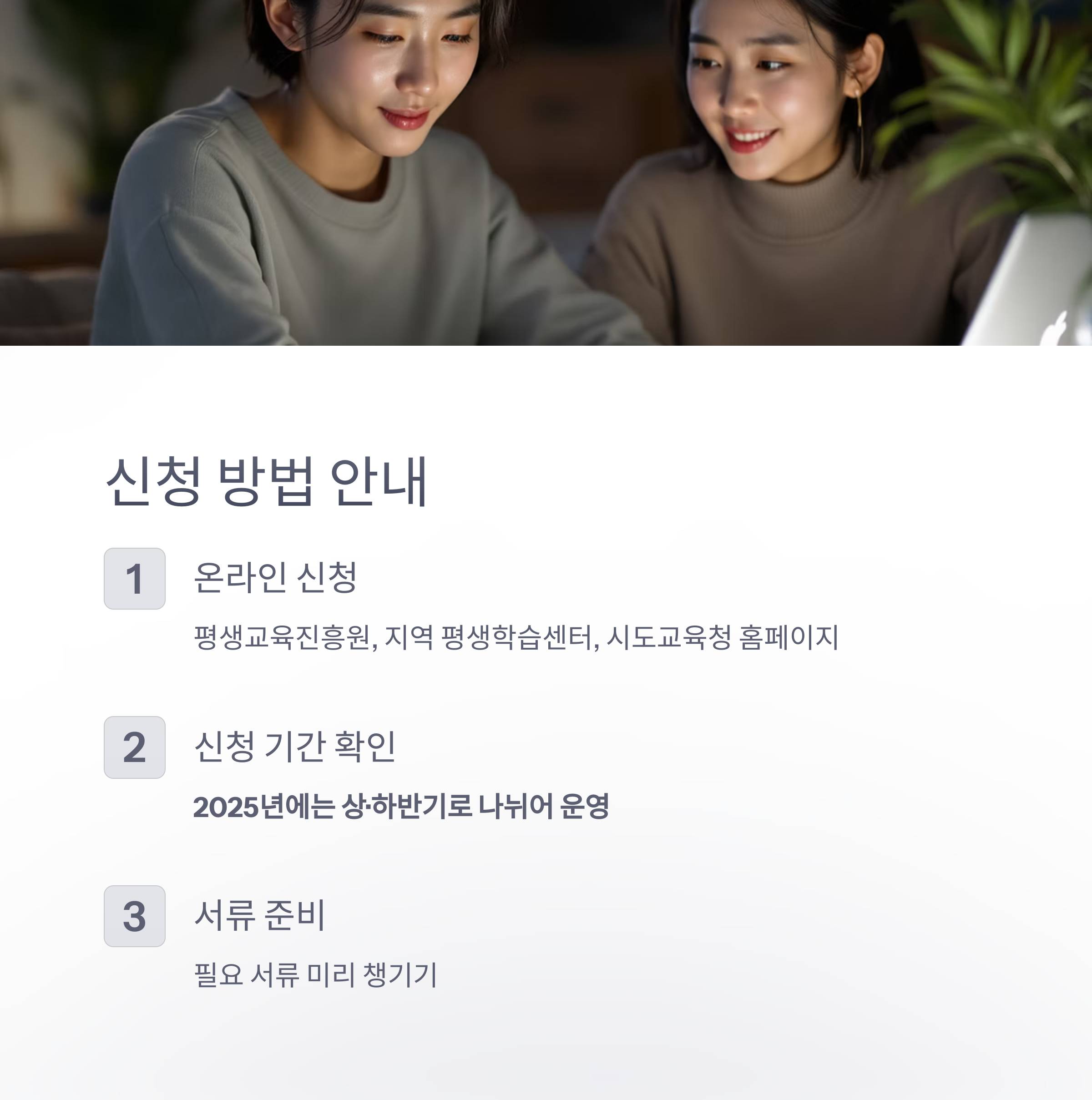 각각 평생교육진흥원과 지역 평생학습센터 또는 시도교육청 홈페이지에서 접수 가능합니다.