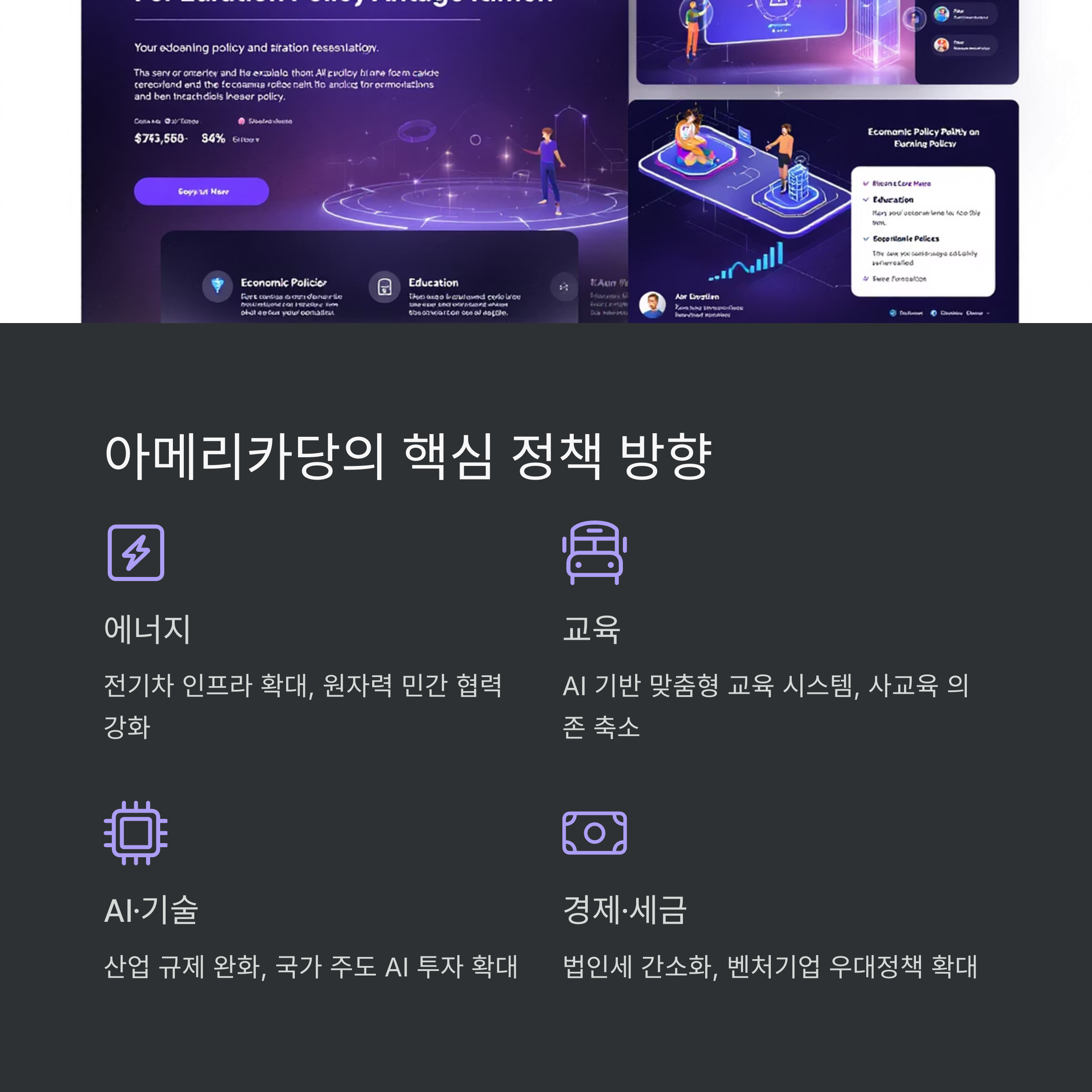 정당 기조는 ‘자유 기술주의’, ‘민간 중심 에너지 정책’, ‘AI 산업 규제 완화’ 등