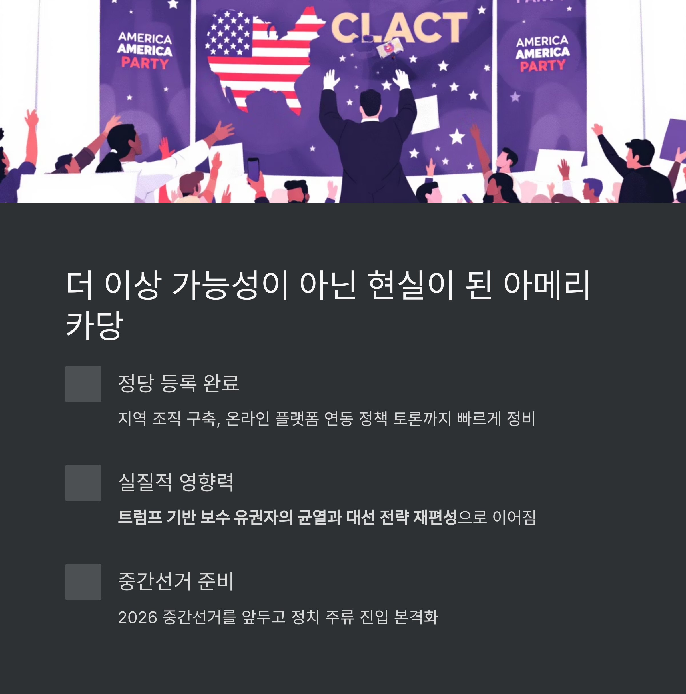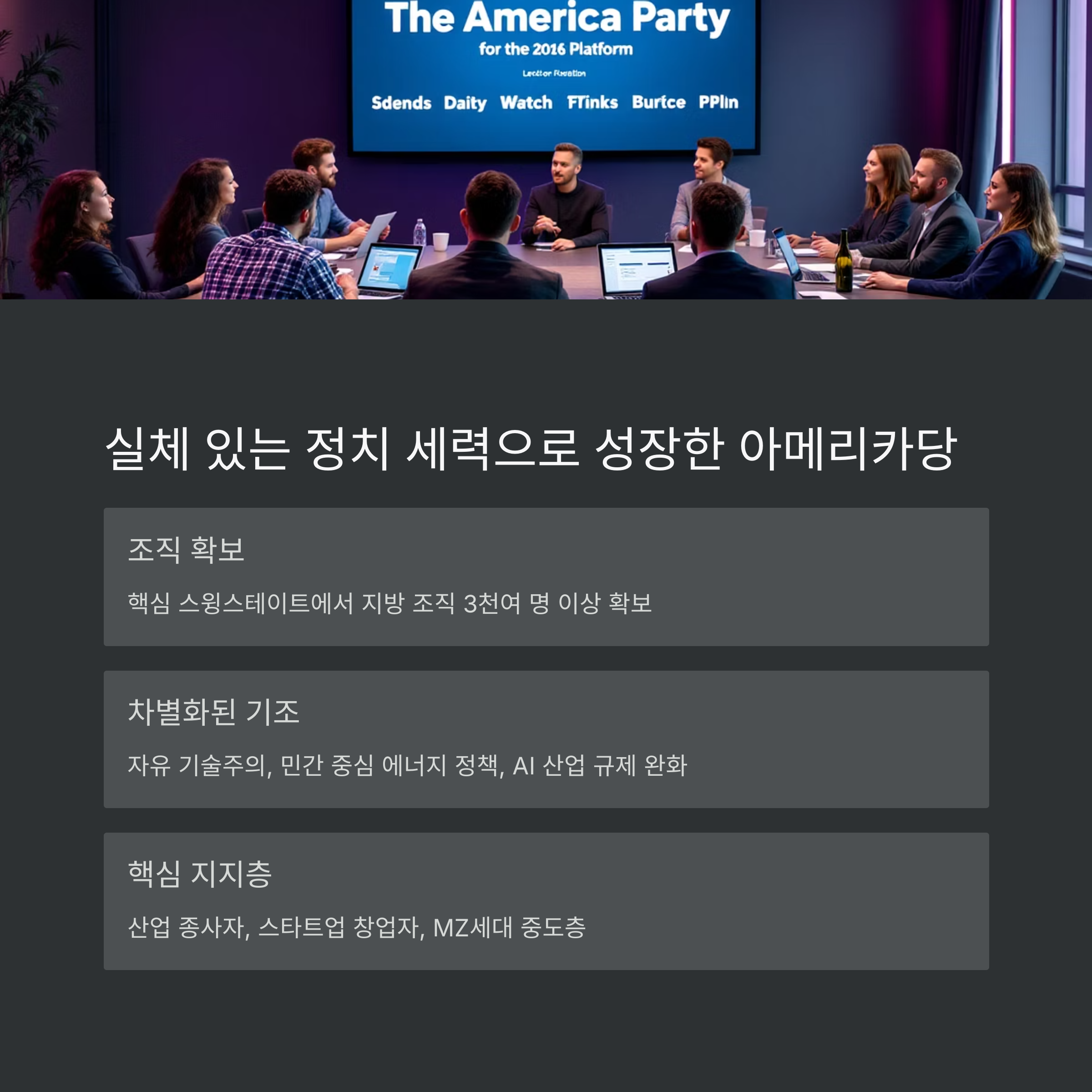 아메리카당은 단순히 ‘머스크 브랜드’를 넘어서 실제 정책 이슈를 중심으로 정당화에 성공하고 있습니다.