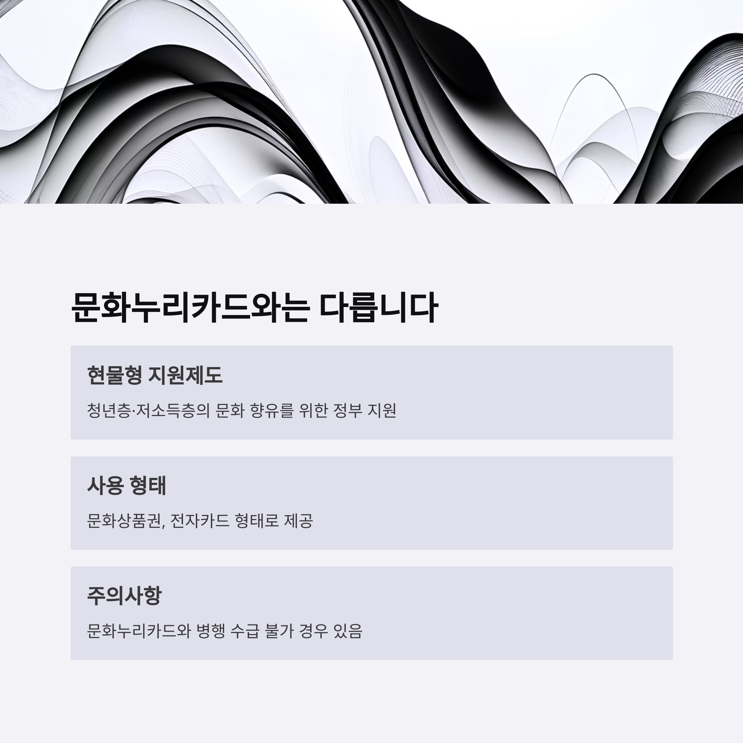 문화누리카드와 유사하지만 지원 대상과 사용범위가 다르며, 병행 수급은 불가한 경우도 있으므로 주의가 필요합니다.