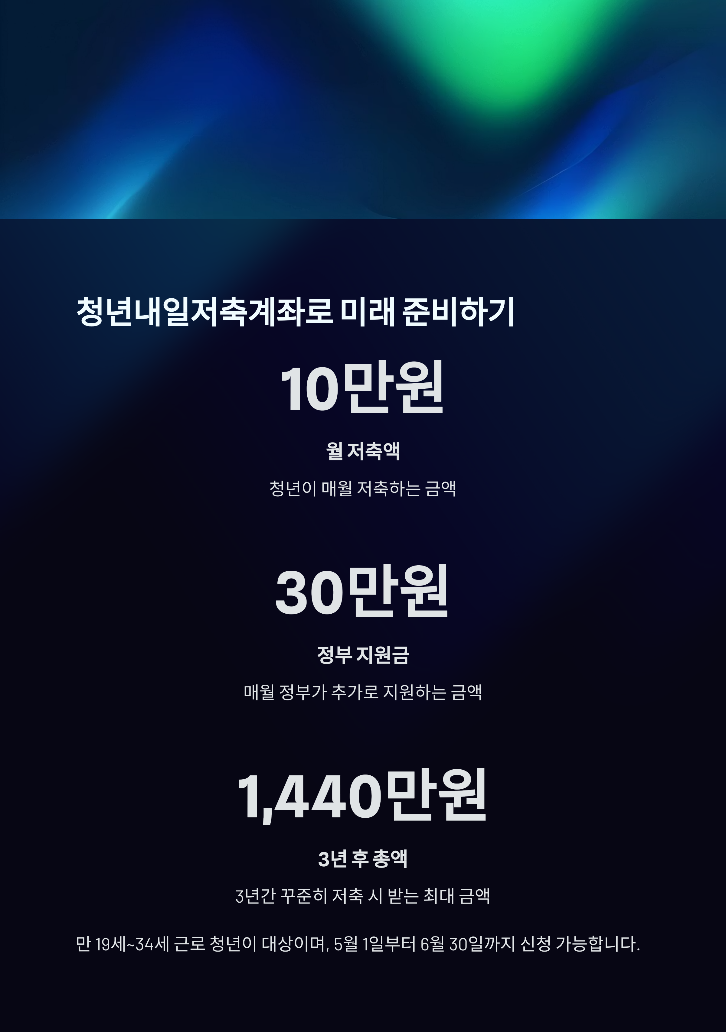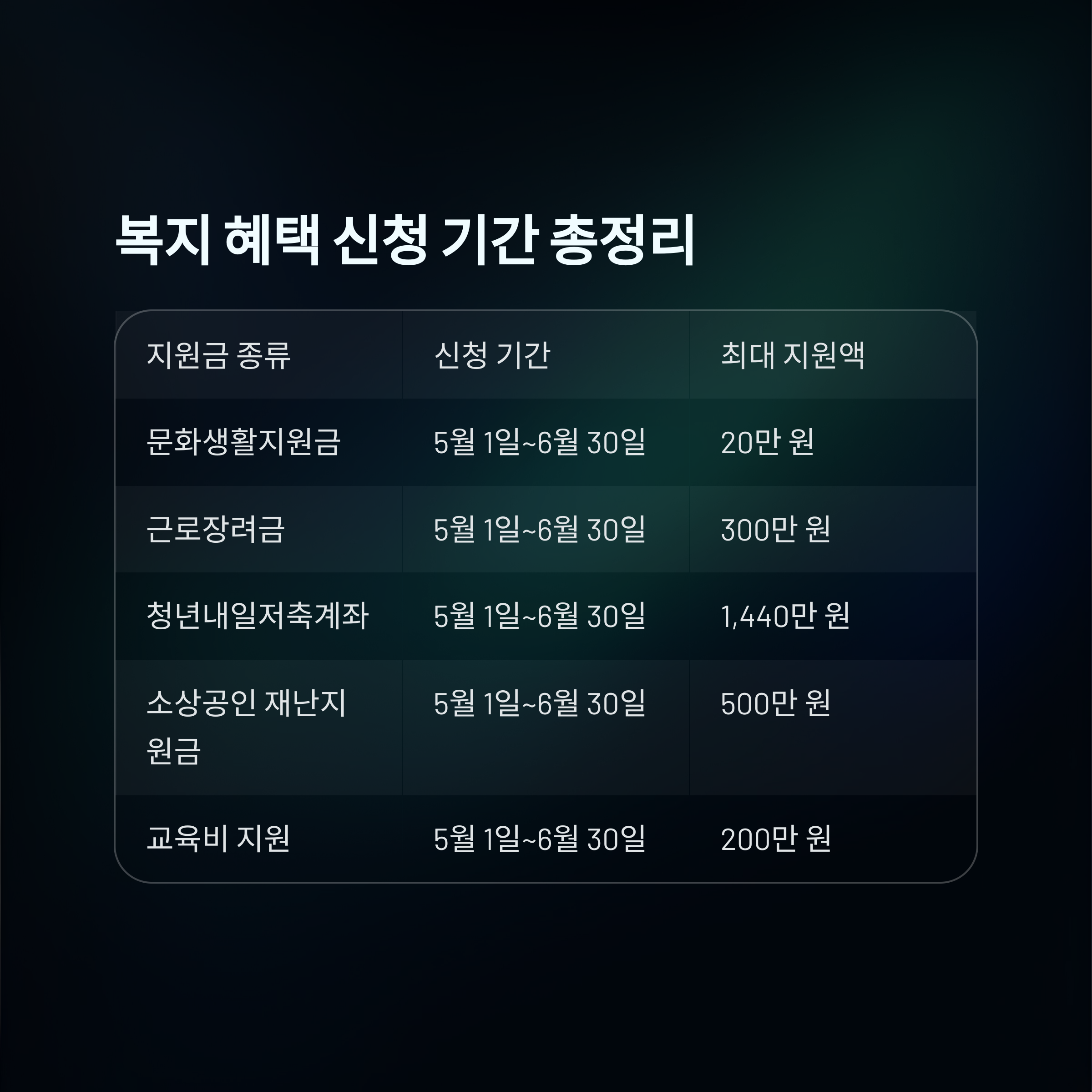 | 청년내일저축계좌 | 5월 1일 ~ 6월 30일 | 최대 1,440만 원 | 복지로 홈페이지 |