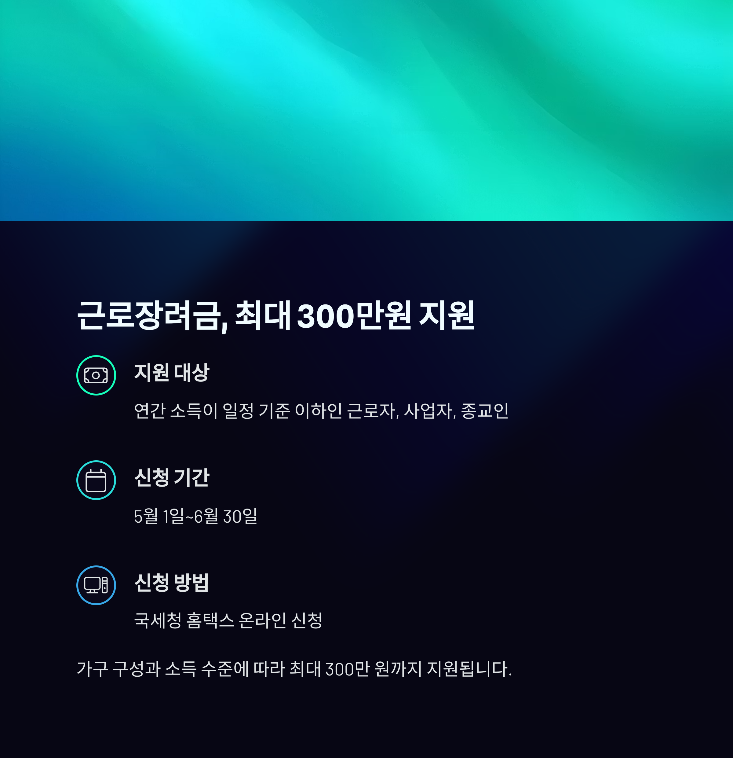 | 근로장려금 | 5월 1일 ~ 6월 30일 | 최대 300만 원 | 국세청 홈택스 |