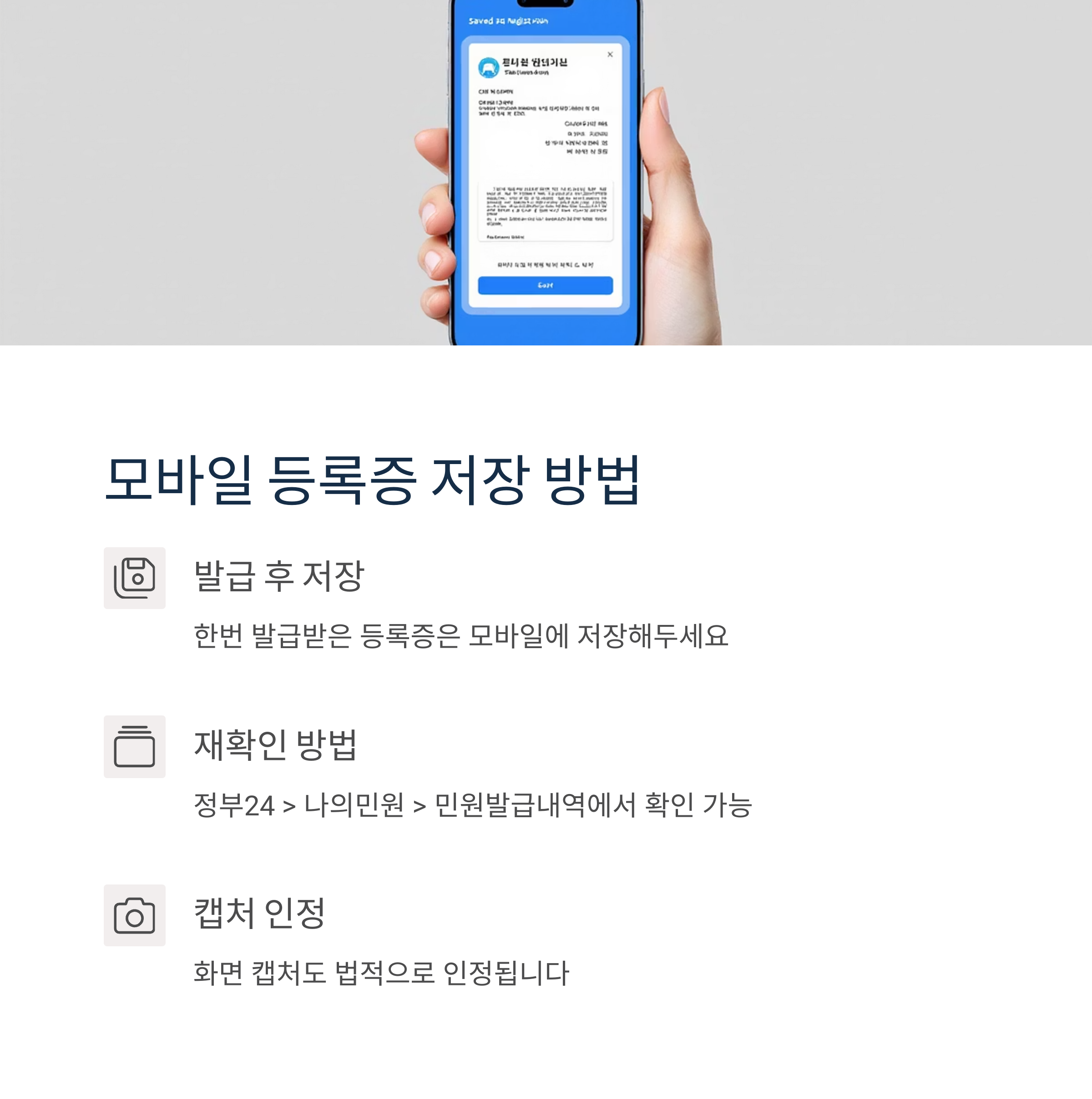 "정부24 > 나의민원 > 민원발급내역"에서 언제든 재확인 가능하며, 캡처 저장도 법적으로 인정됩니다.