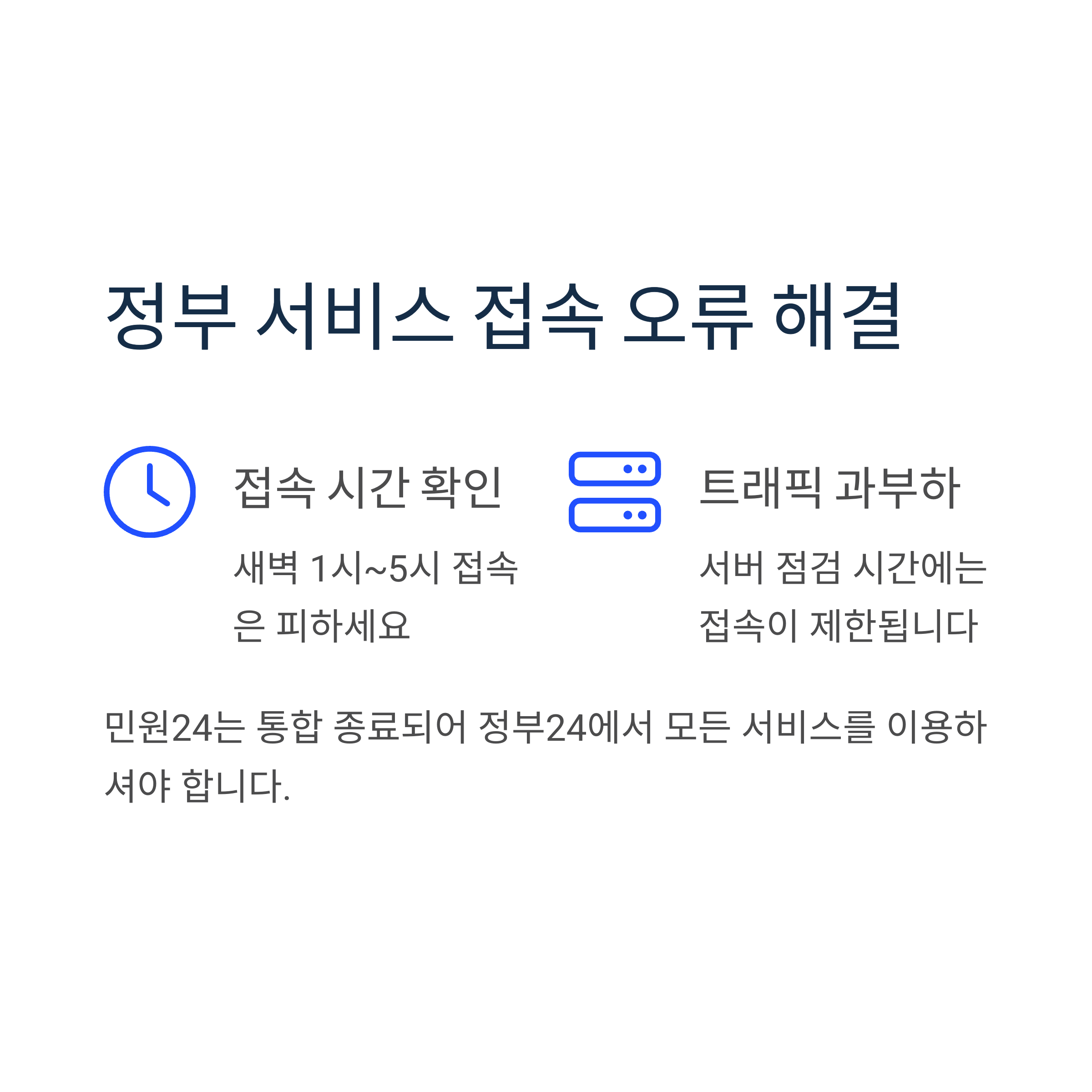 정부 서비스 접속이 갑자기 안 되는 경우는 트래픽 과부하나 서버 점검 시간 때문일 수 있습니다.
