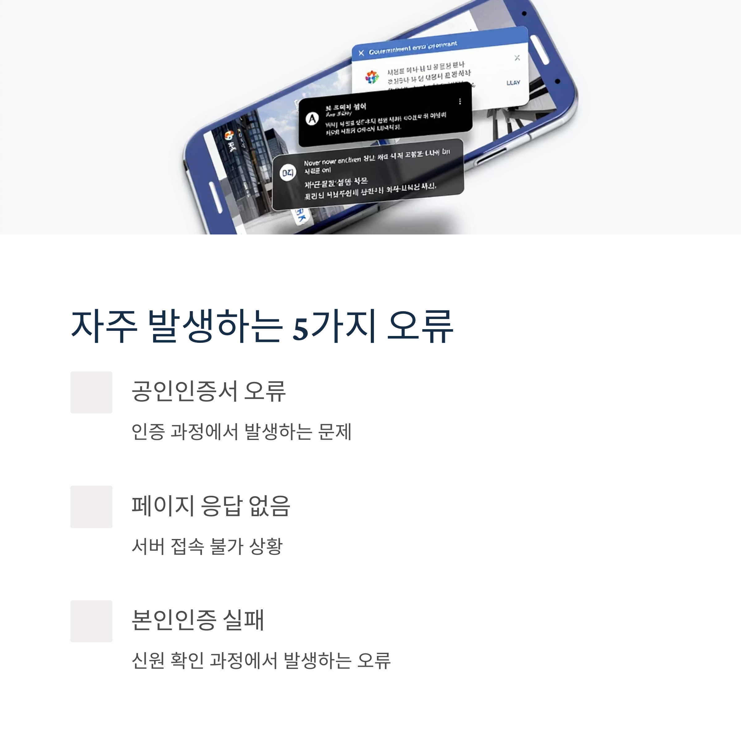 특히 '공인인증서 오류', '페이지 응답 없음', '본인인증 실패' 등 사용자가 당황할 수 있는 문제들이 자주 나타납니다.