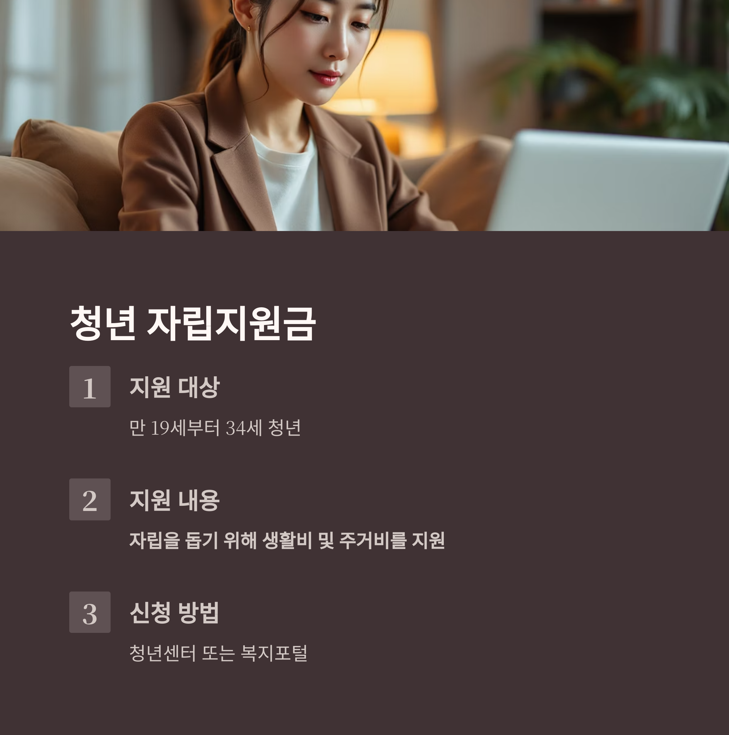 만 19세부터 34세 청년을 대상으로 자립을 돕기 위해 생활비 및 주거비를 지원합니다.