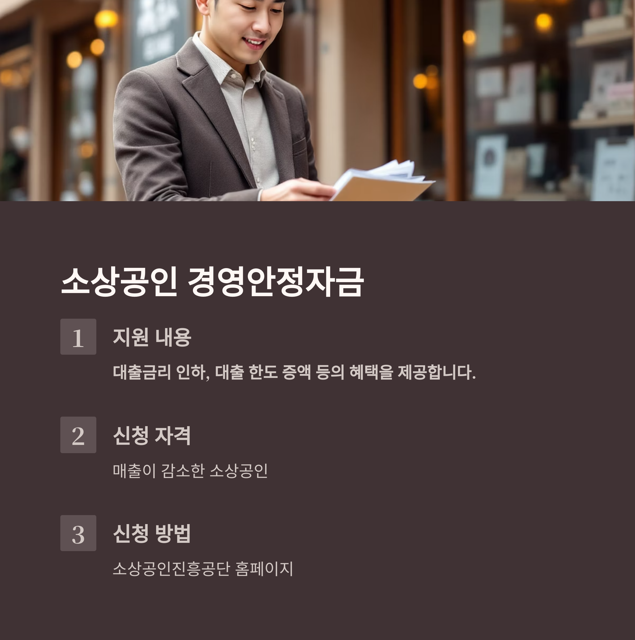 소상공인의 경영 안정을 위해 대출금리 인하, 대출 한도 증액 등의 혜택을 제공합니다.