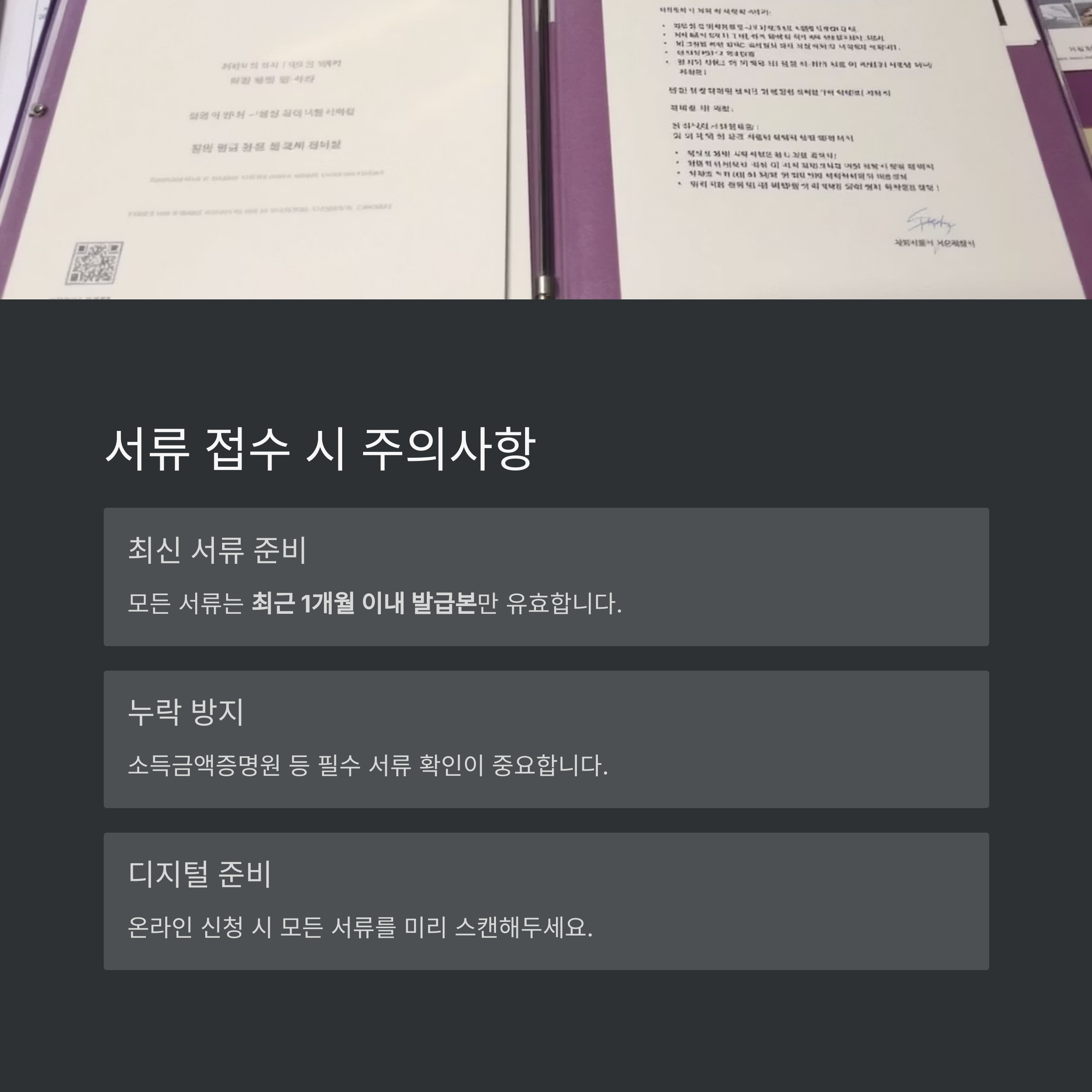 핵심 팁: 모든 서류는 최근 1개월 이내 발급본만 유효하므로, 구비서류 발급일을 꼭 확인해야 합니다.