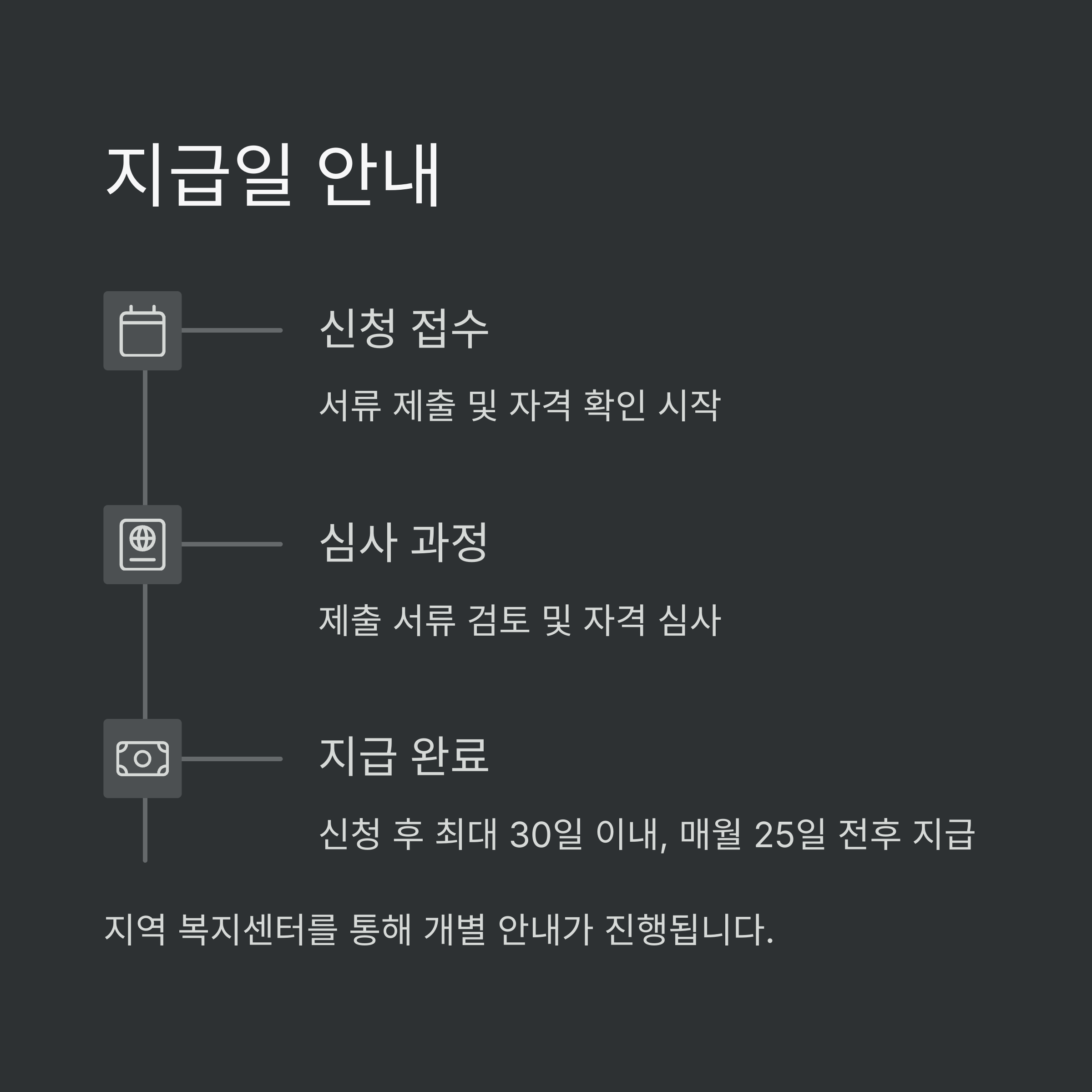 지급일은 매월 25일 전후로 고정되며, 지역 복지센터를 통해 개별 안내가 진행됩니다.