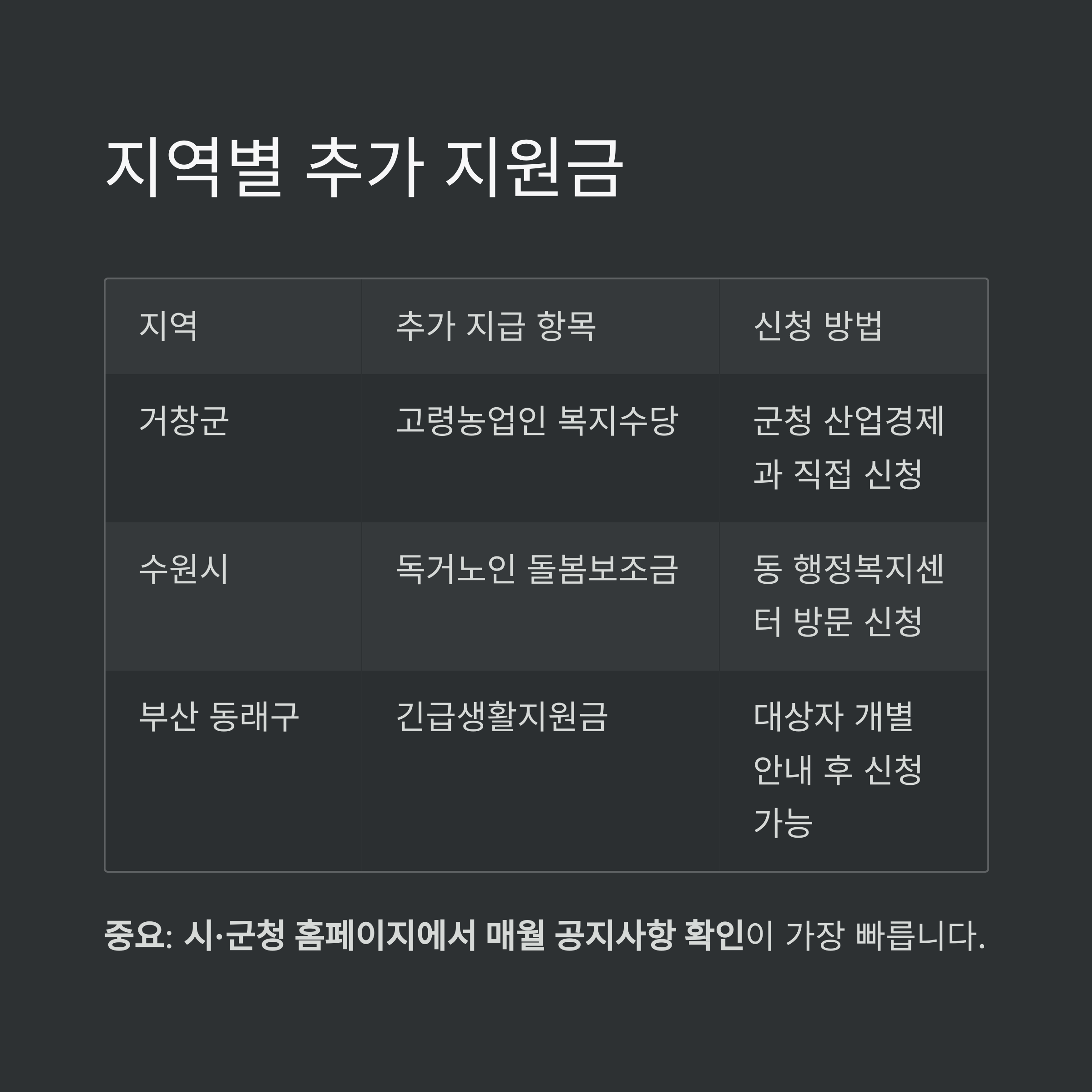 중요: 시·군청 홈페이지에서 매월 공지사항 확인이 가장 빠릅니다.