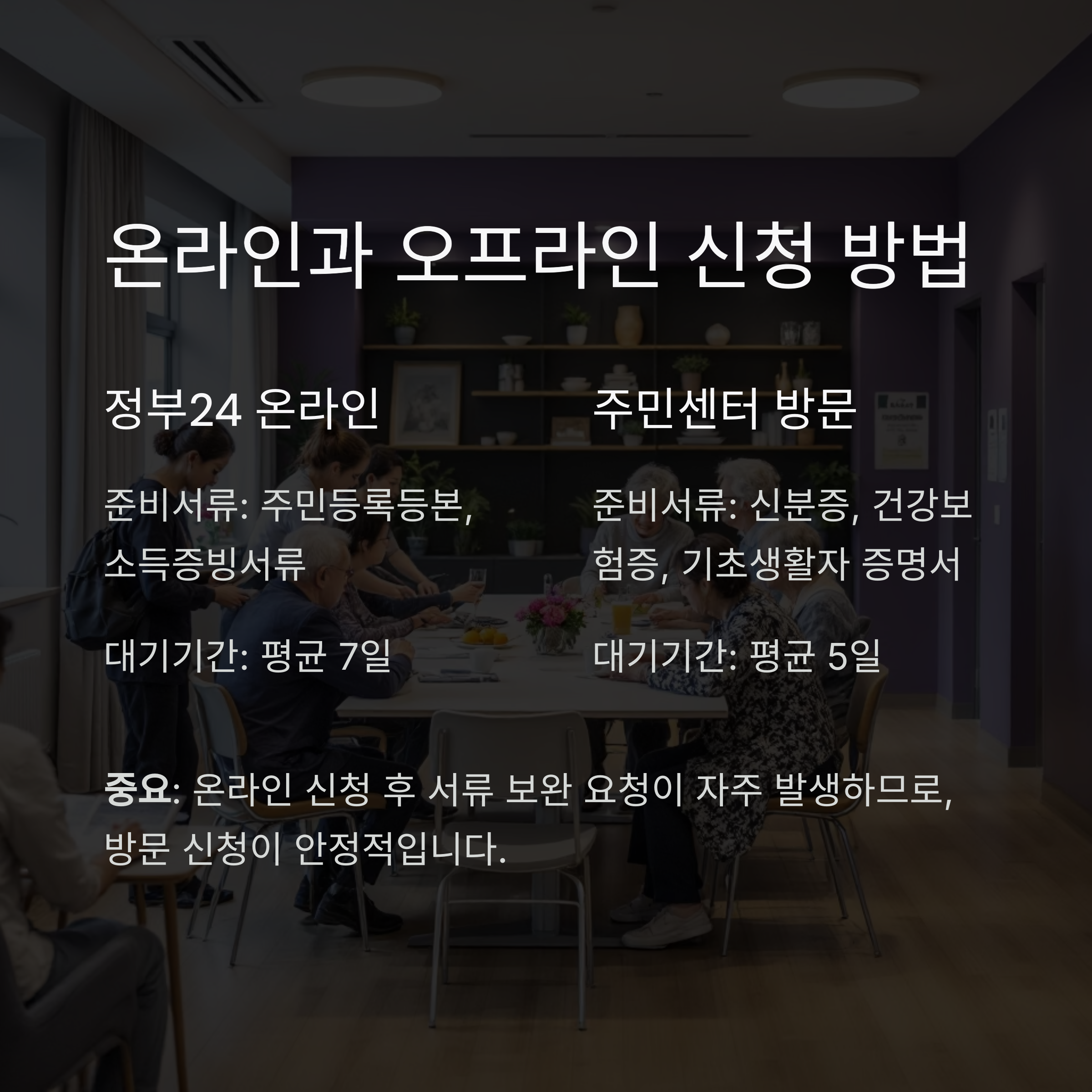 중요: 온라인 신청 후 서류 보완 요청이 자주 발생하므로, 방문 신청이 안정적입니다.