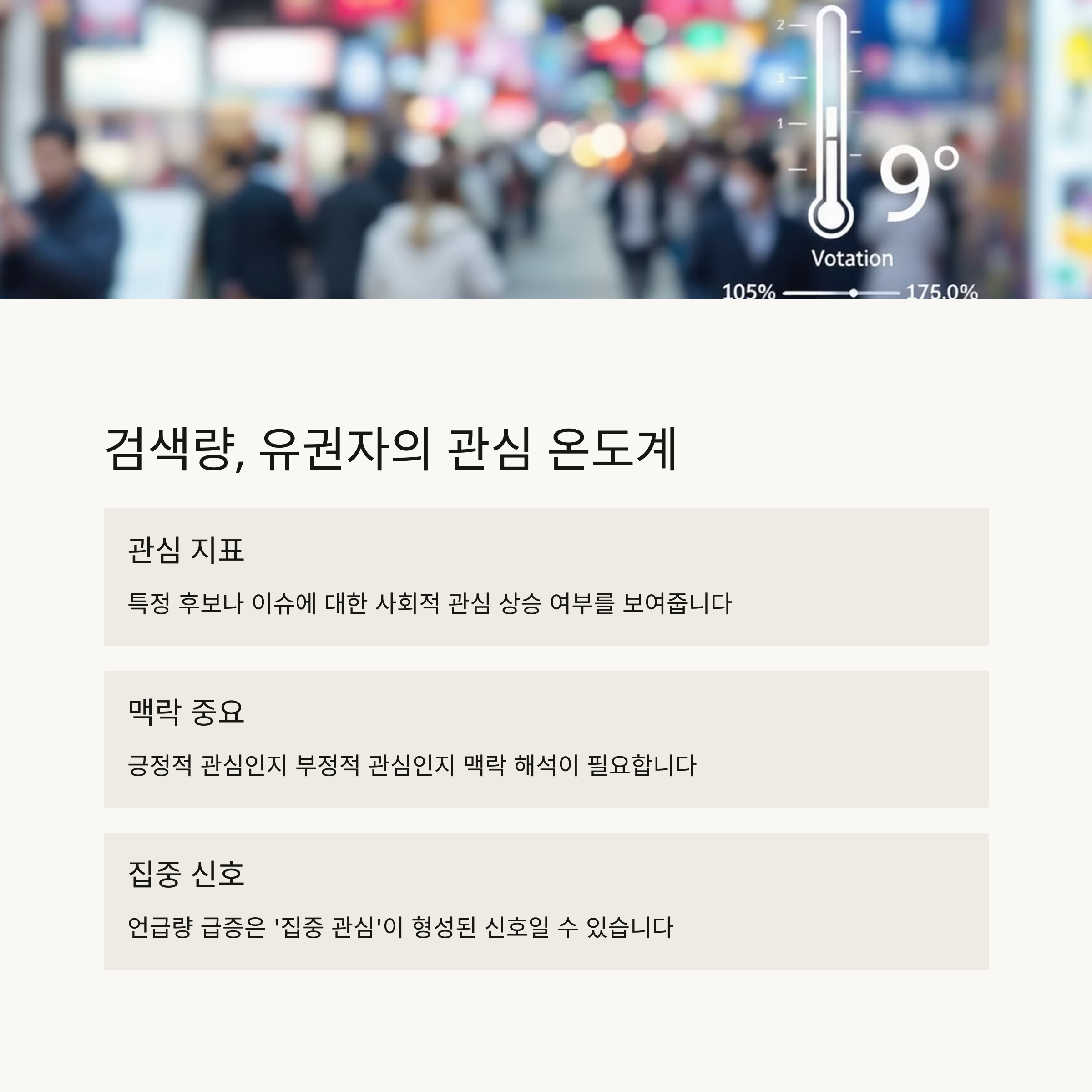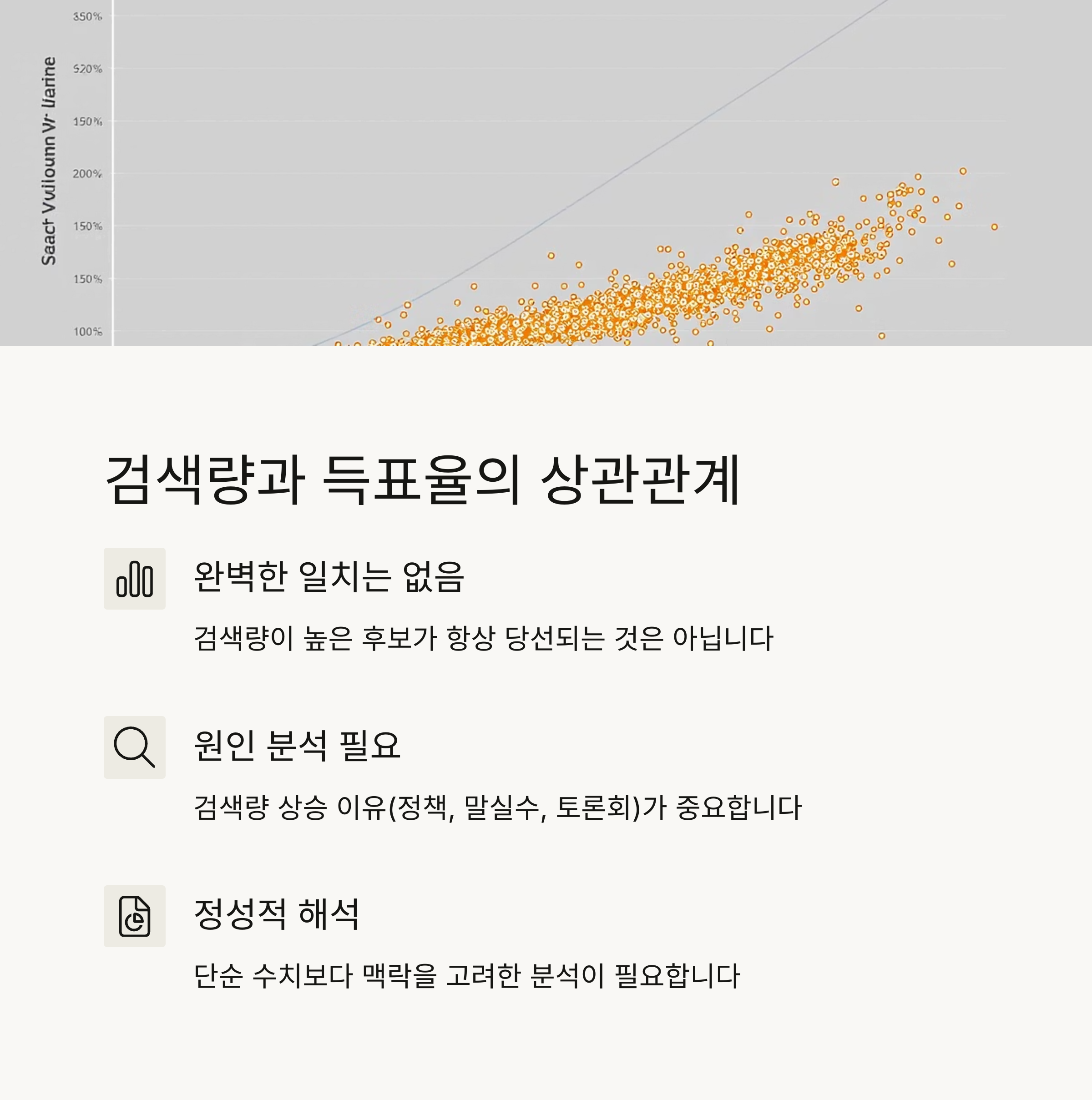 중요한 것은 '검색량 자체'보다 그 검색량이 상승한 이유입니다. 정책 이슈, 말실수, 토론회 반응 등 다양한 원인에 따라 검색이 급증할 수 있으므로 이를 정성적으로 해석하는 분석이 필요합니다.