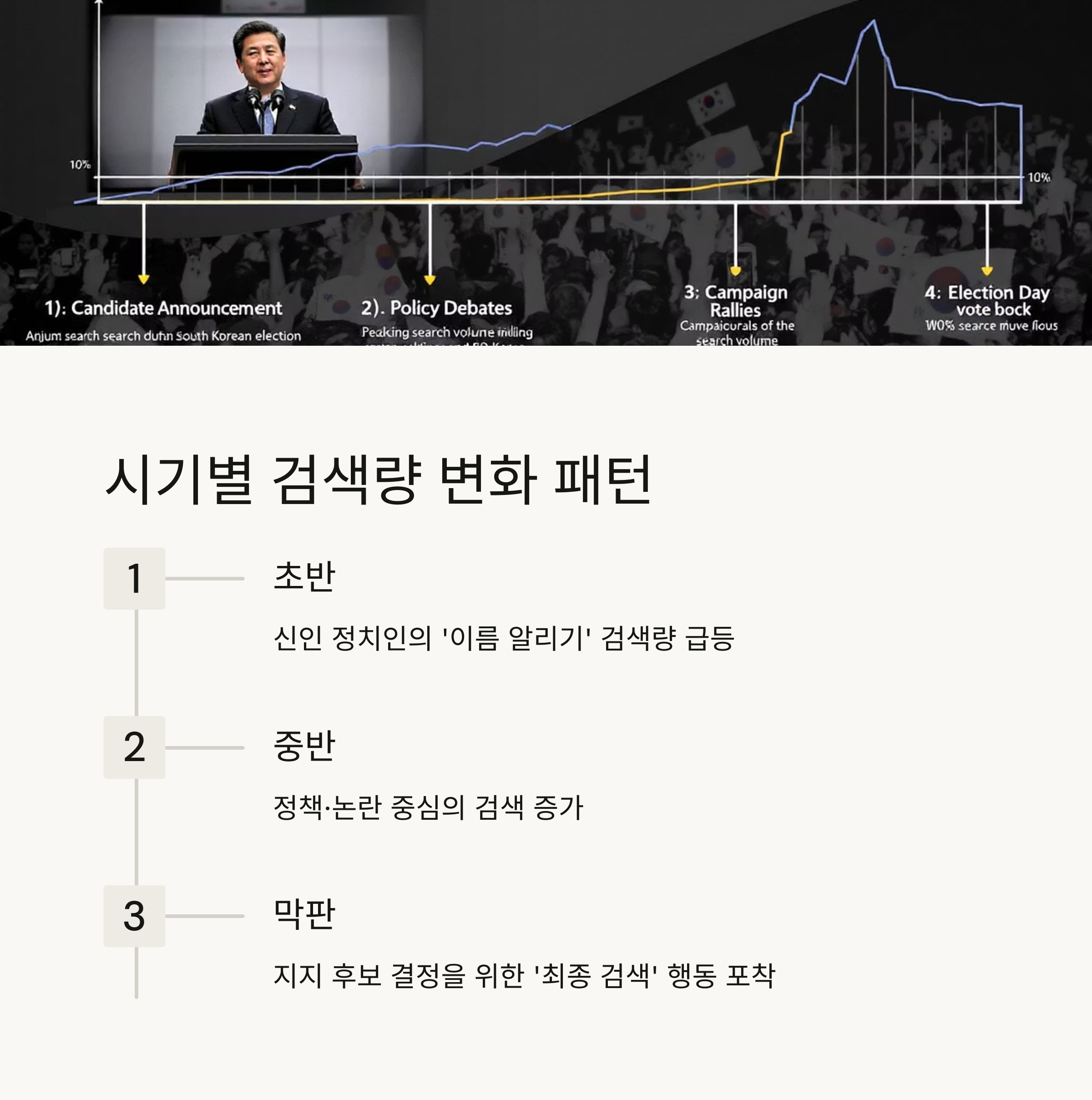 초반에는 '이름 알리기'에 집중하는 후보들이 많아 신인 정치인의 검색량이 급등하는 경향이 있고, 중반 이후에는 정책·논란 중심의 검색이 증가하며 막판에는 실제 지지 후보를 결정하려는 유권자의 '최종 검색' 행동이 포착되곤 합니다.