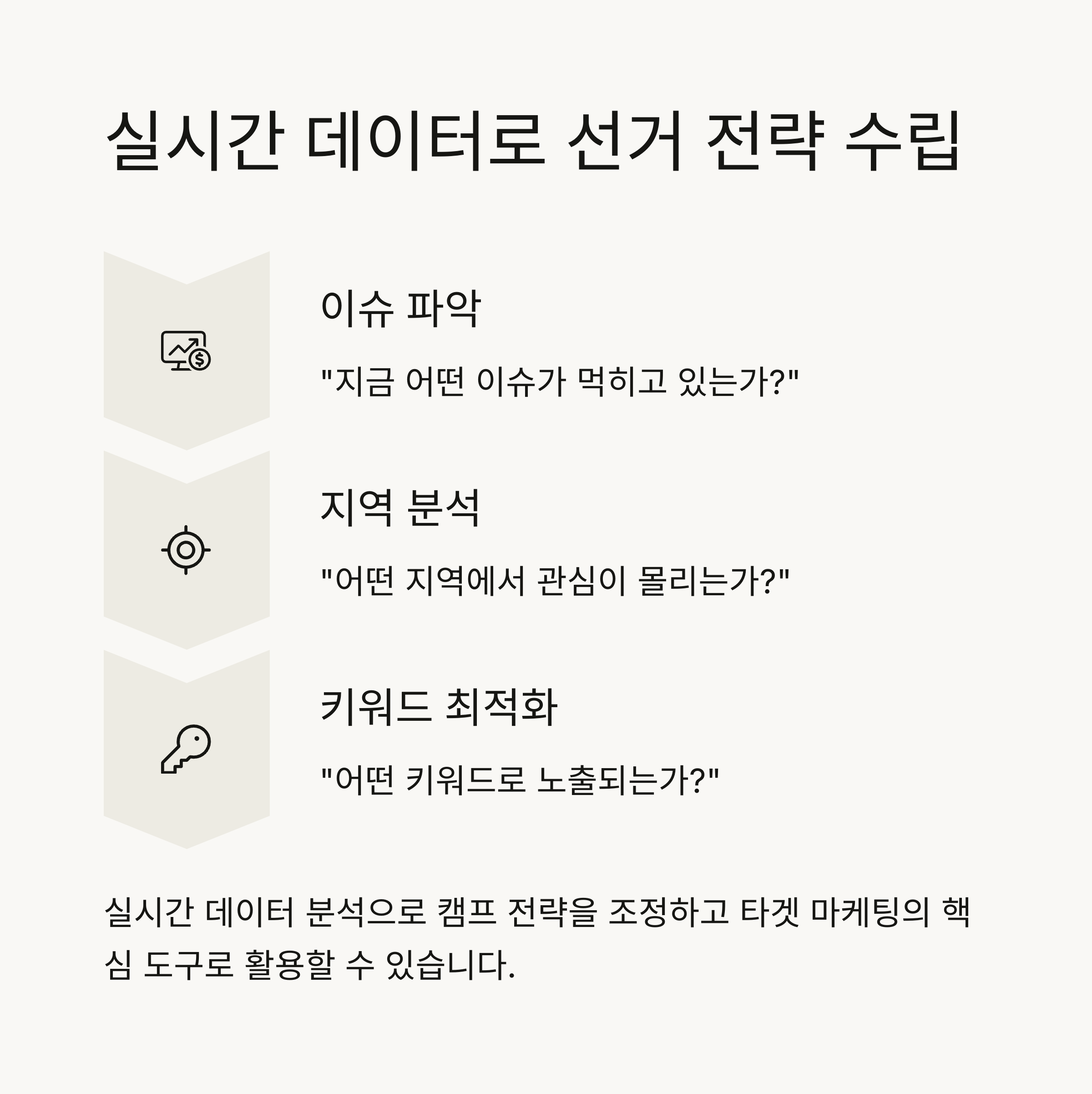 이런 데이터를 실시간으로 분석해 캠프 전략을 조정할 수 있으며, 선거판세를 좌우할 수 있는 타겟 마케팅의 핵심 도구로 떠오르고 있습니다.
