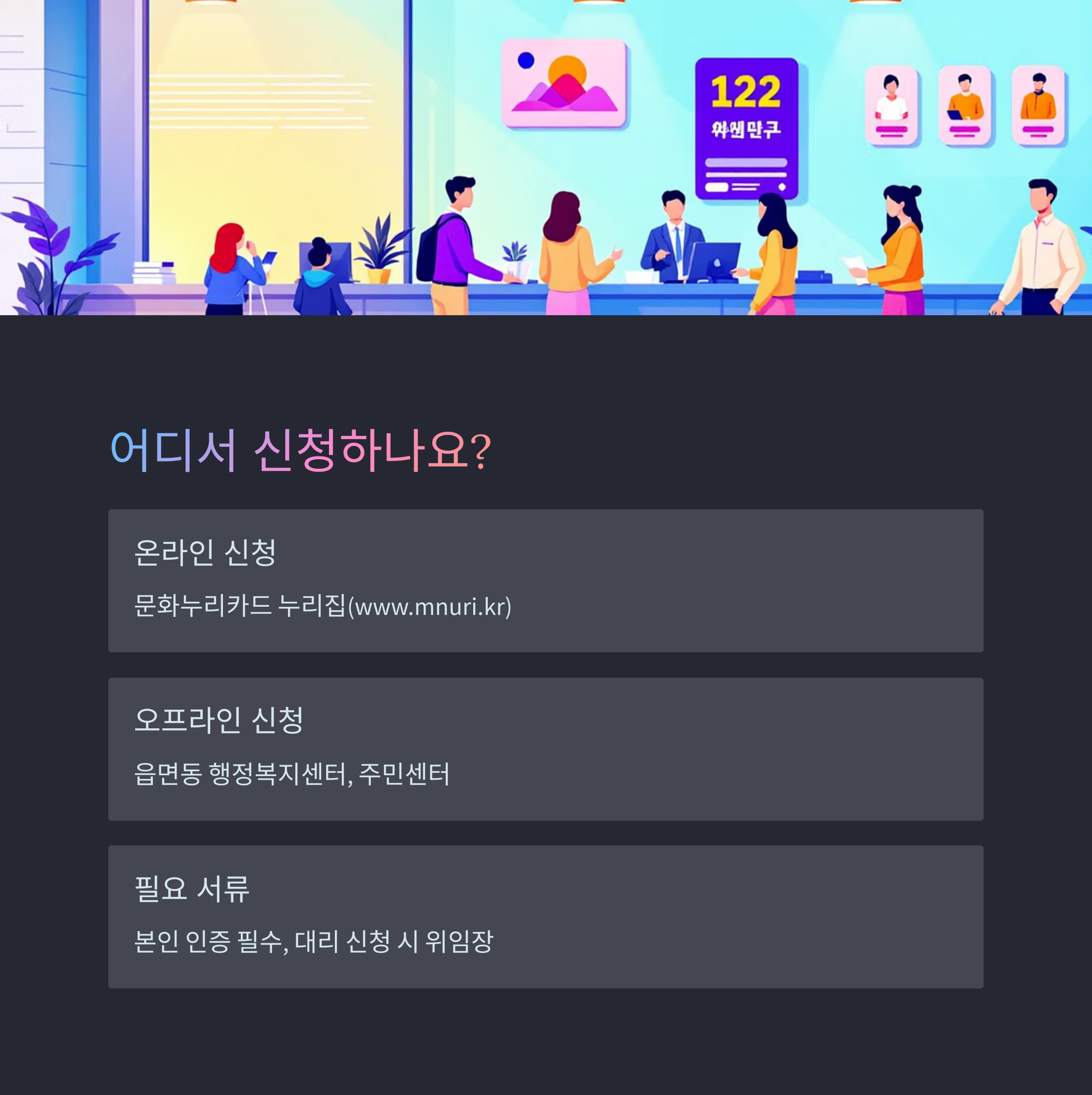 오프라인은 읍면동 행정복지센터, 주민센터에서 신청할 수 있습니다.