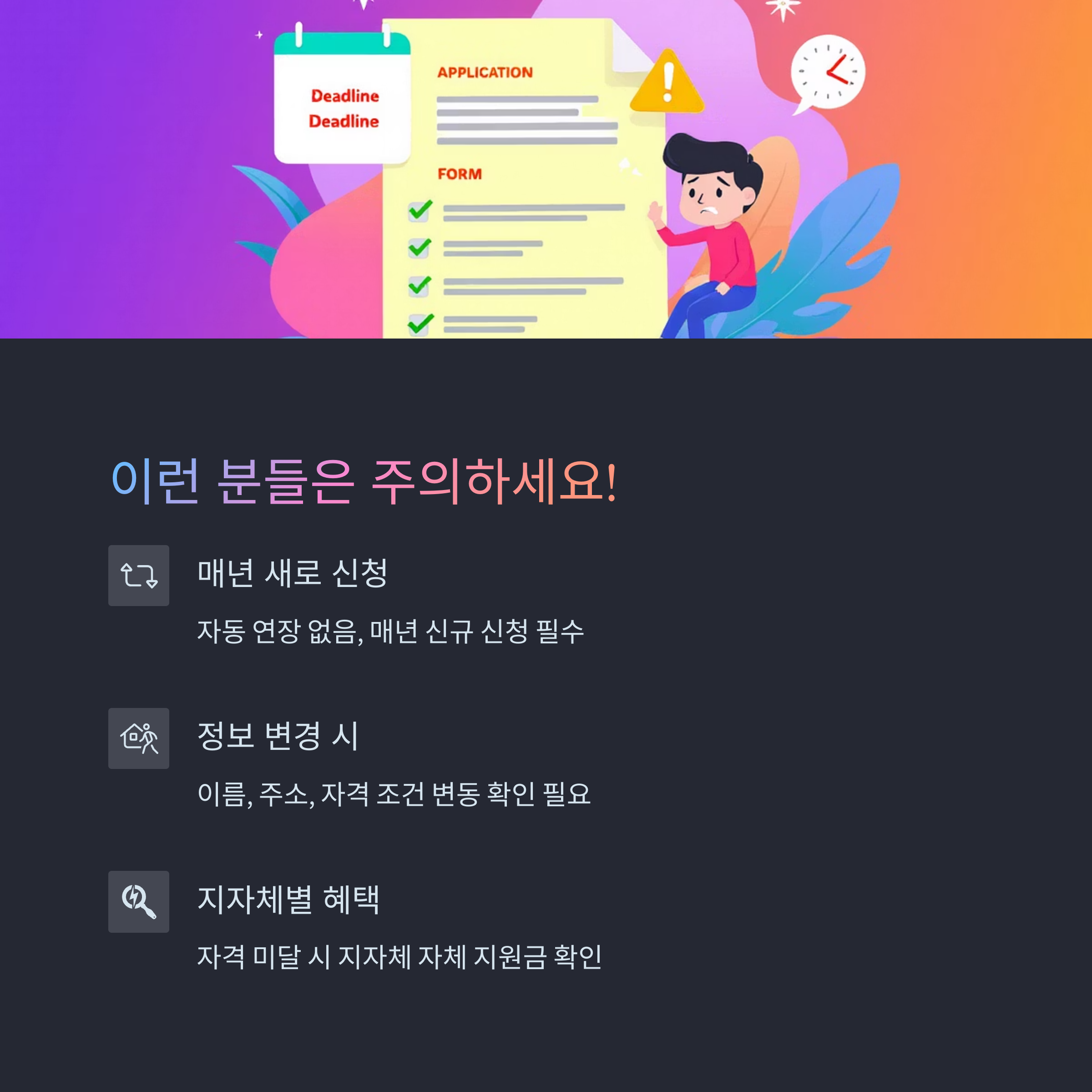 또한 이름 변경, 주소 이전, 자격 조건 변동이 있는 경우 신청 전 반드시 확인이 필요합니다.