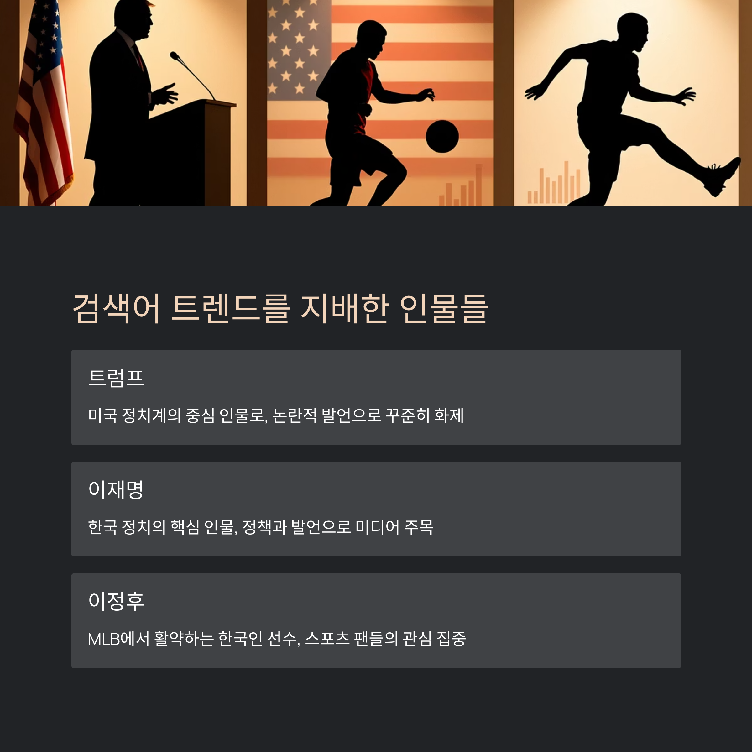 2025년 상반기, 트럼프, 이재명, 이정후는 각자의 분야에서 두각을 나타내며 검색어 상위권을 차지했습니다. 이들의 공통점은 대중의 관심을 끌어모은 전략에 있습니다. 이 글에서는 이들이 어떻게 검색어 상위에 올랐는지, 그 배경과 전략을 7가지 알고리즘 법칙으로 분석합니다.