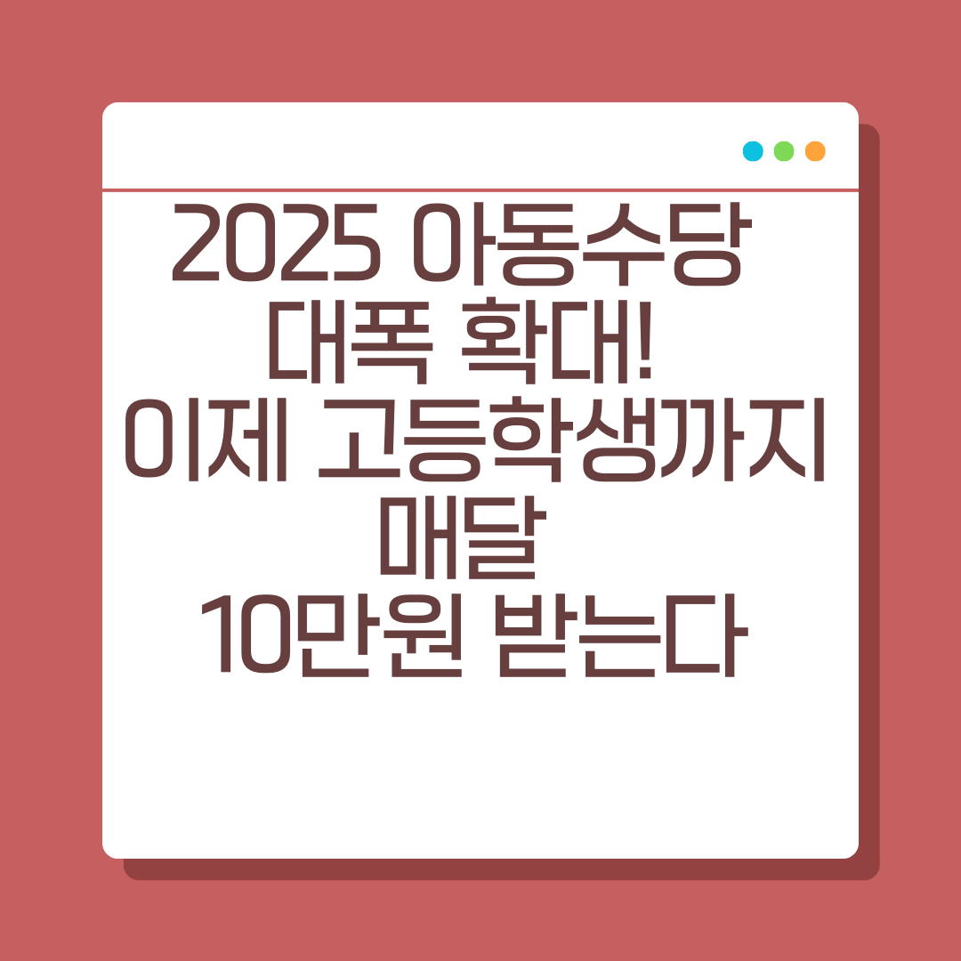 2025년부터 아동수당 지급 연령이 대폭 확대됩니다. 기존 만 8세 미만까지만 가능했던 수당 지급이 이제는 매년 2살씩 늘어나 2029년에는 고등학생까지 지급될 예정입니다. 이 글에서는 최신 발표 내용을 바탕으로 연령별 확대 일정, 신청 방법, 증여세 관련 유의사항까지 한 번에 정리해 드립니다.
