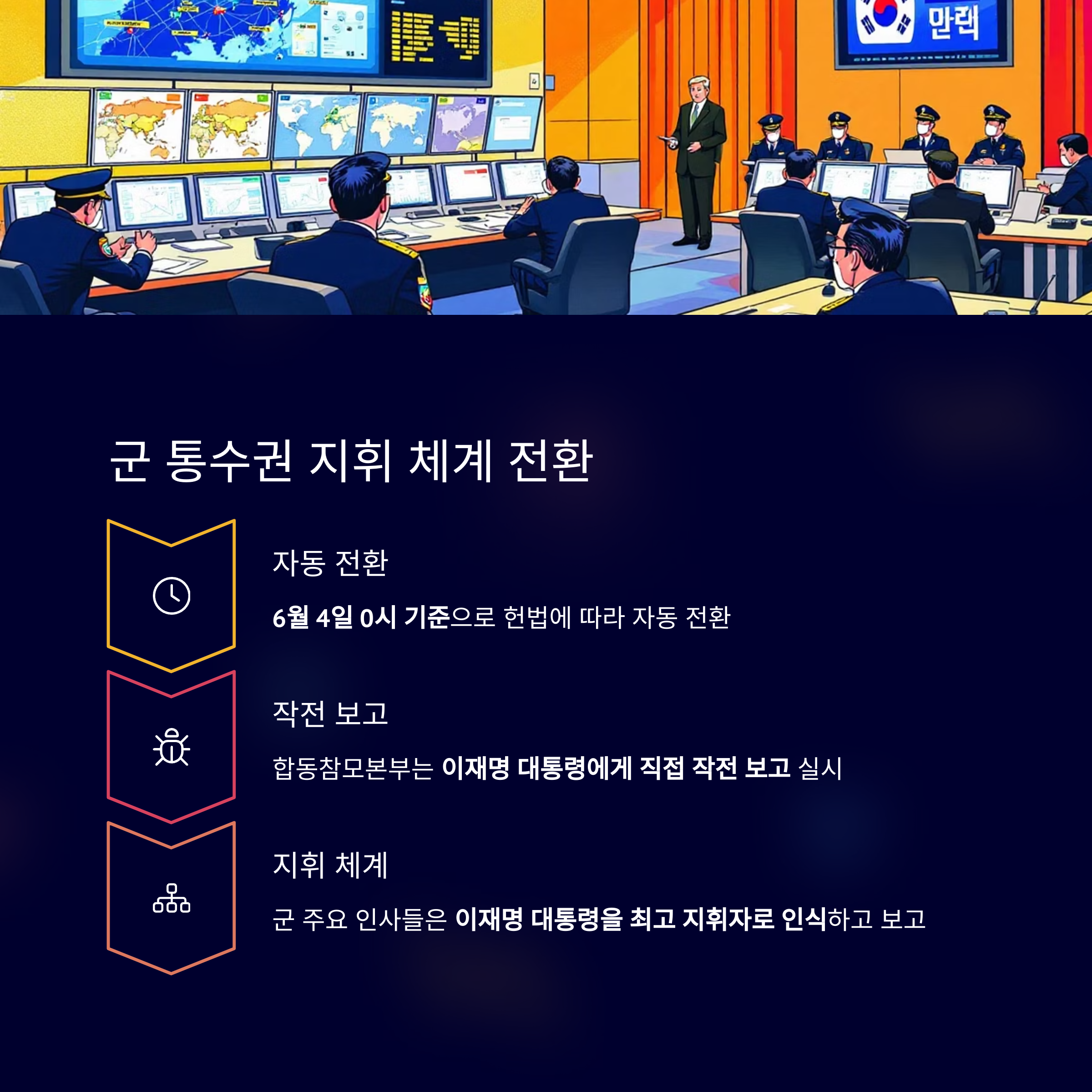 군 작전 보고, 국가정보 동향, 외교 현안 등 모든 핵심 지휘 보고가 기존 대통령에서 이재명 대통령으로 자동 전환됩니다