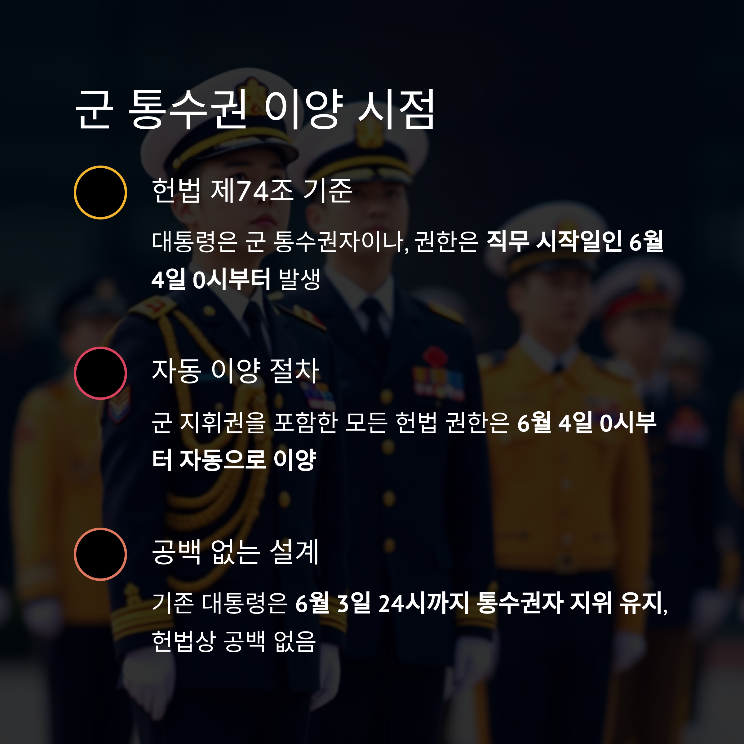 군 통수권 이양은 헌법 기준에 따라 6월 4일 0시를 기준으로 자동 전환됩니다